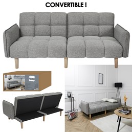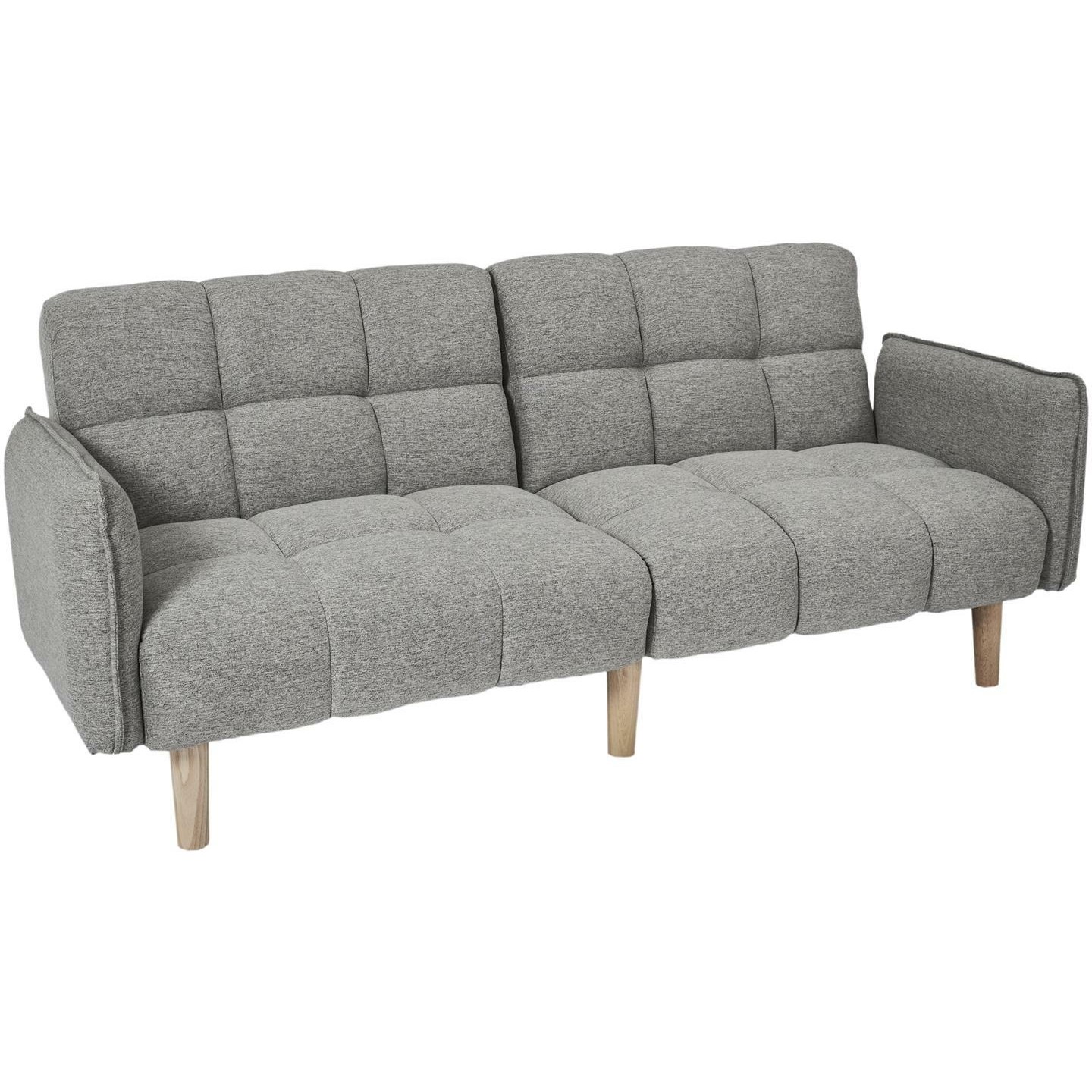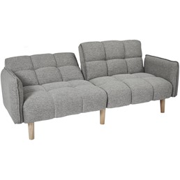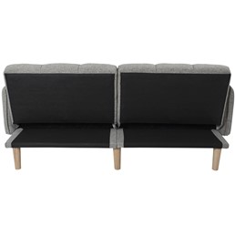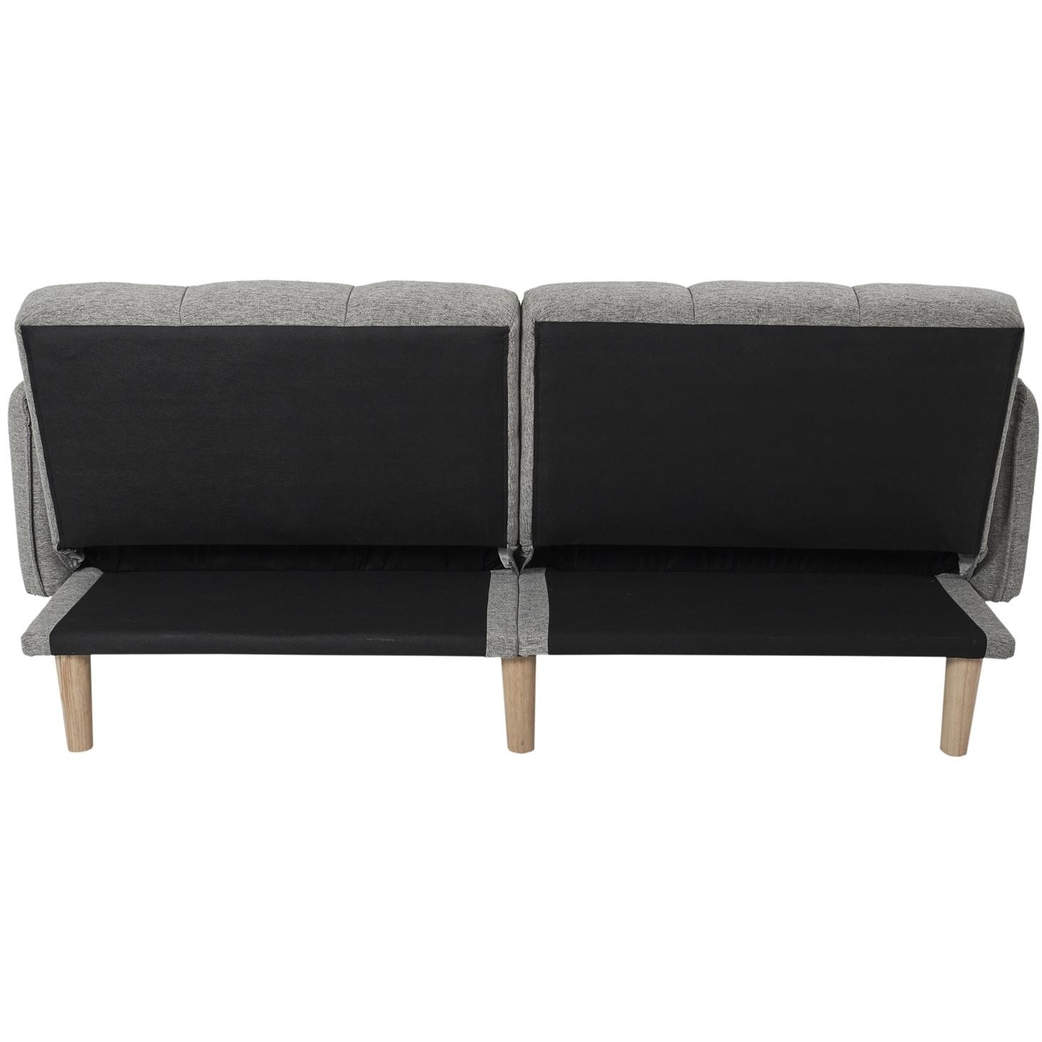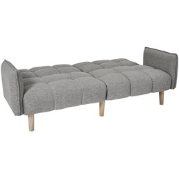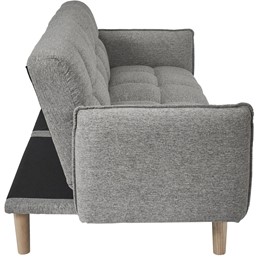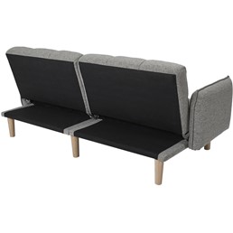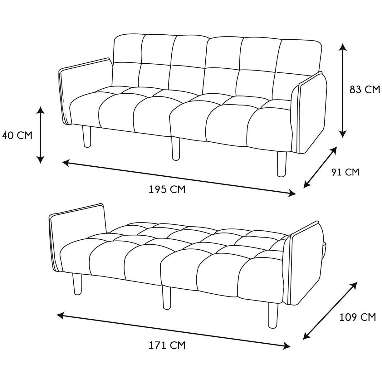 Sofa posiada czarne plastikowe nogi, które dodają jej lekkości i stabilności. Wymiary sofy to 196 cm szerokości, 98 cm głębokości i 91 cm wysokości. Po rozłożeniu oferuje powierzchnię spania 196x123 cm, co czyni ją funkcjonalnym rozwiązaniem na noclegi.