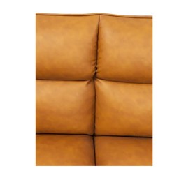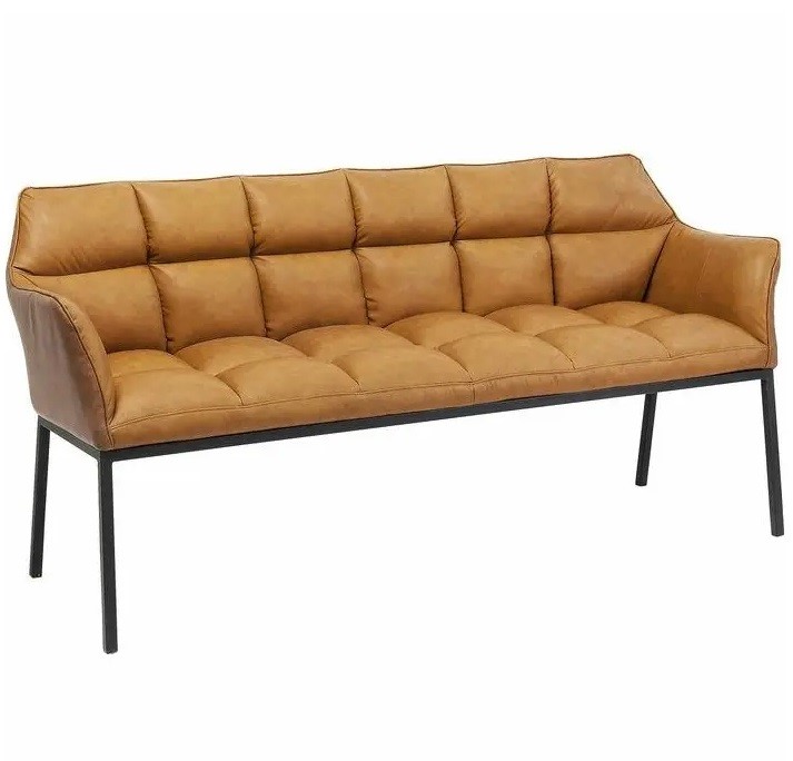 Wygodne siedzisko o kształcie muszli z zaokrąglonymi podłokietnikami wykonano z brązowej skóry a czarną, smukłą podstawę ze stali.