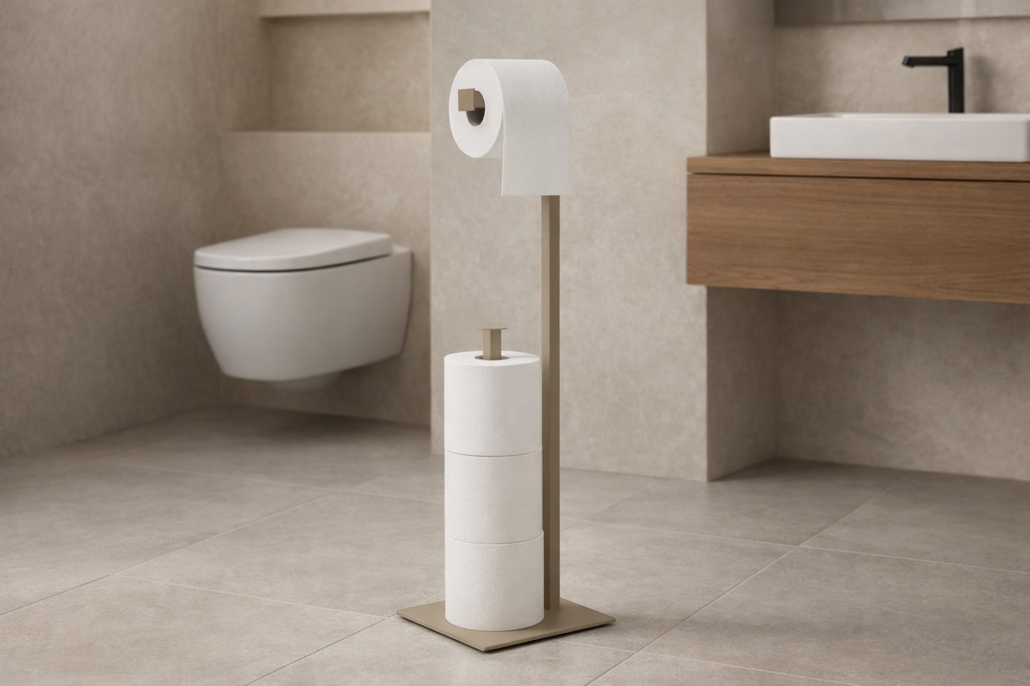 Stojak na papier toaletowy to funkcjonalny i stylowy dodatek, który doskonale sprawdzi się w każdej łazience. Wykonany z wysokiej jakości materiałów gwarantuje trwałość i odporność na korozję. Stojak jest stabilny i wygodny w użytkowaniu, a jego elegancki design wpasowuje się w różnorodne aranżacje wnętrz. Dzięki swojemu minimalistycznemu wyglądowi, stojak na papier toaletowy nie tylko pełni praktyczną funkcję, ale również stanowi estetyczny element dekoracyjny w łazience.