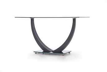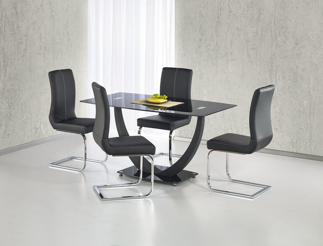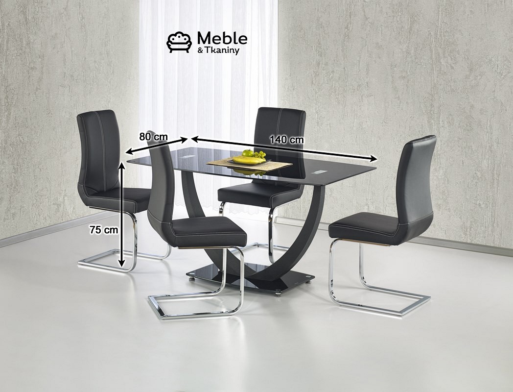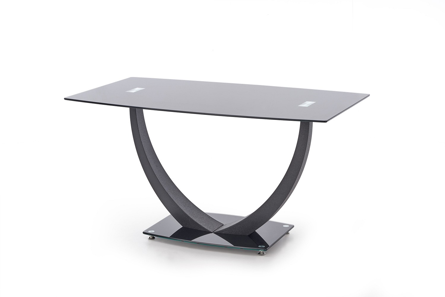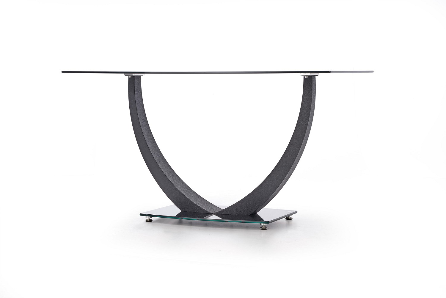 ANTON to niezwykły stół o charakterystycznej podstawie w kształcie litery „U”. W pewnością będzie ciekawym punktem dekoracyjnym z salonie lub jadalni. Idealnie sprawdzi się podczas rodzinnych spotkań lub wspólnych posiłków. Podstawa stołu wykonana została ze stali i polakierowana na kolor czarny. Blat ze szkła hartowanego jest w kolorze czarnym.