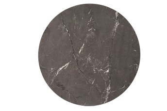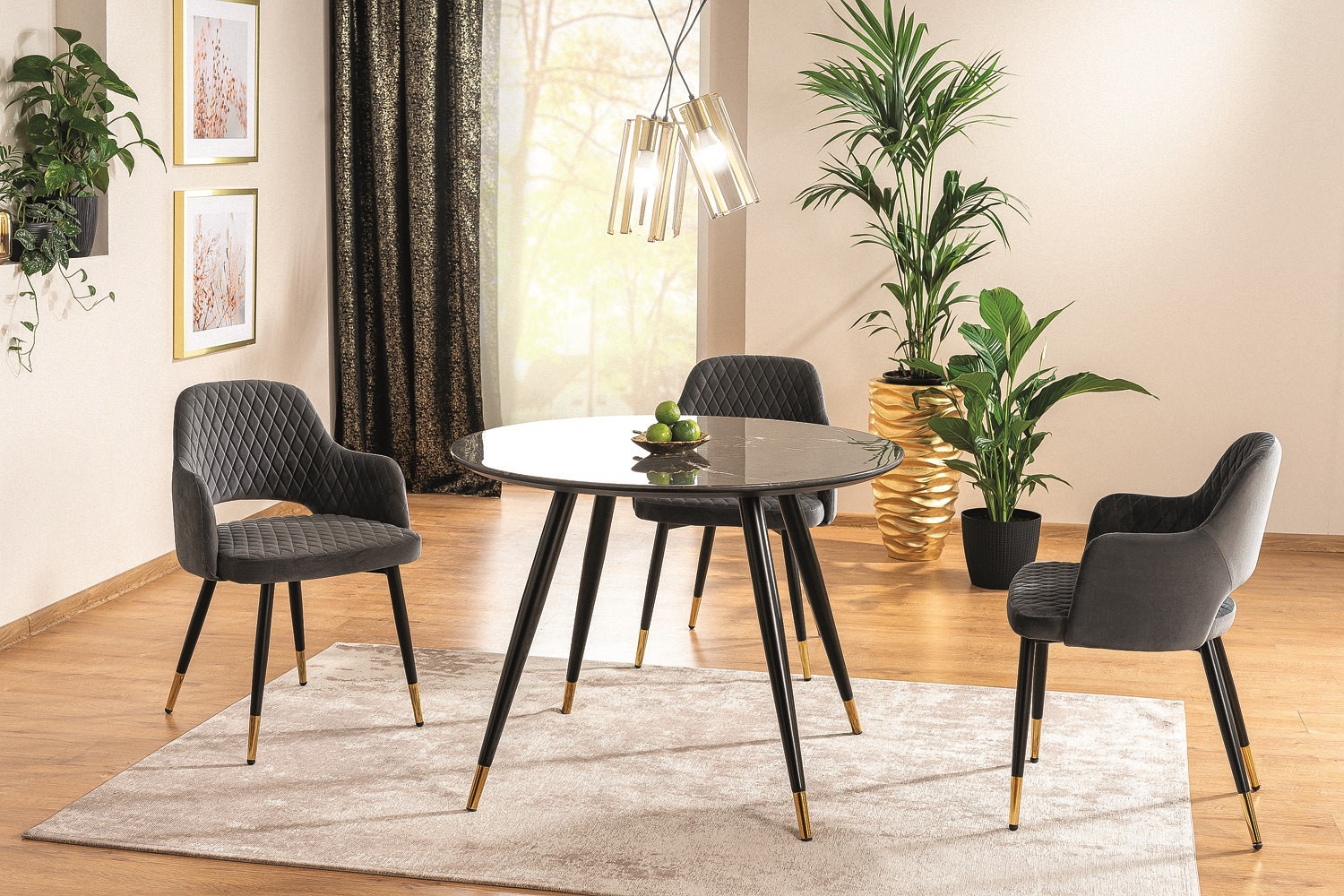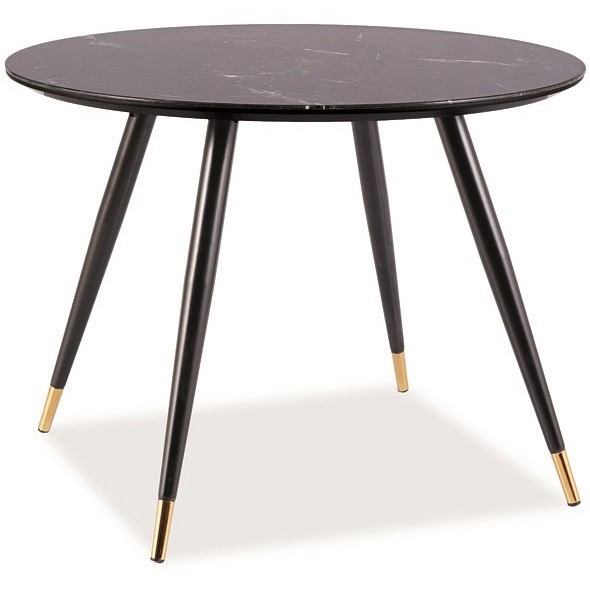 Okrągły stół o eleganckim designie, który doskonale wpasuje się w nowoczesne i stylowe wnętrza. Blat wykonany z wysokiej jakości materiału o wyglądzie czarnego marmuru, który nadaje mu luksusowego charakteru. Nogi stołu są smukłe, metalowe, w czarnym kolorze, zakończone złotymi akcentami, co dodaje całości wyrafinowania.