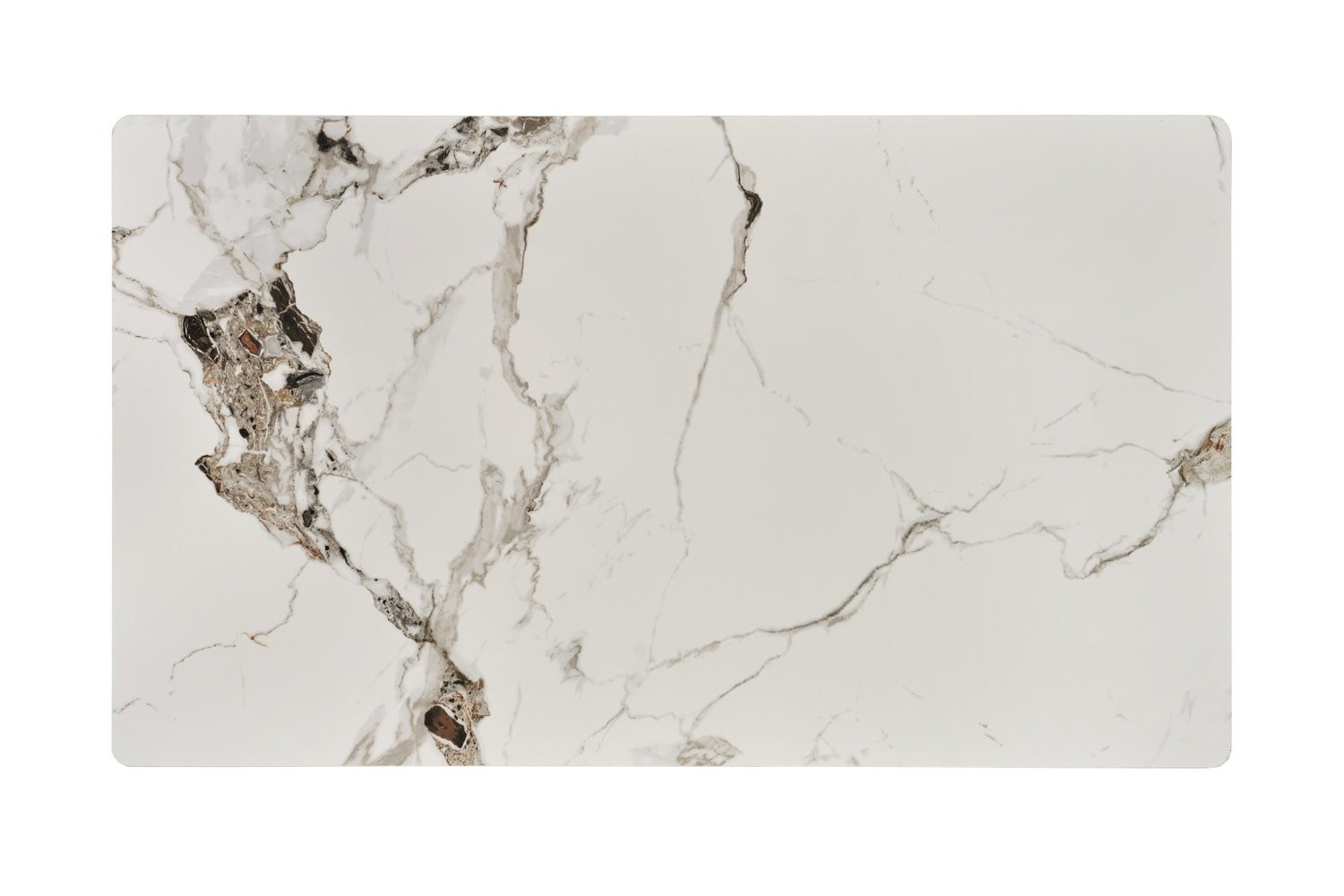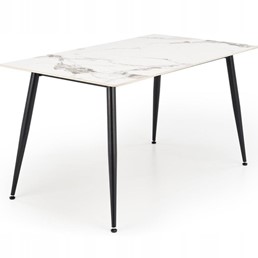 Blat stołu Emilio wykonany jest z imitacji białego marmuru, co nadaje mu luksusowego wyglądu. Marmurowy wzór dodaje elegancji i finezji, tworząc jednocześnie trwałą i odporną powierzchnię.