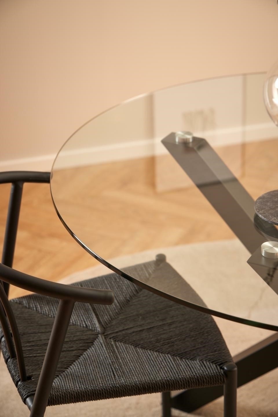 Stół Heaven o średnicy 119 cm to nowoczesny mebel, który łączy elegancki, transparentny blat z solidną czarną podstawą. Jego okrągły kształt i prosta forma wprowadza do wnętrza przestronność i lekkość. Idealny do nowoczesnych salonów i jadalni.