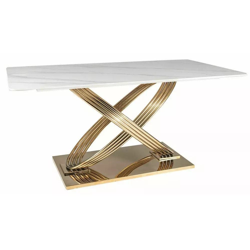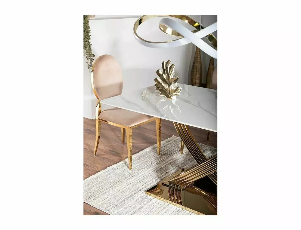 Stół Hermes 90x160 cm łączy w sobie nowoczesny design i funkcjonalność. Jego ceramiczny blat w efekt marmuru dodaje elegancji, a stal nierdzewna w kolorze złotym zapewnia stabilność i trwałość. To doskonały wybór do jadalni lub salonu, wprowadzający luksusowy akcent do każdego wnętrza.