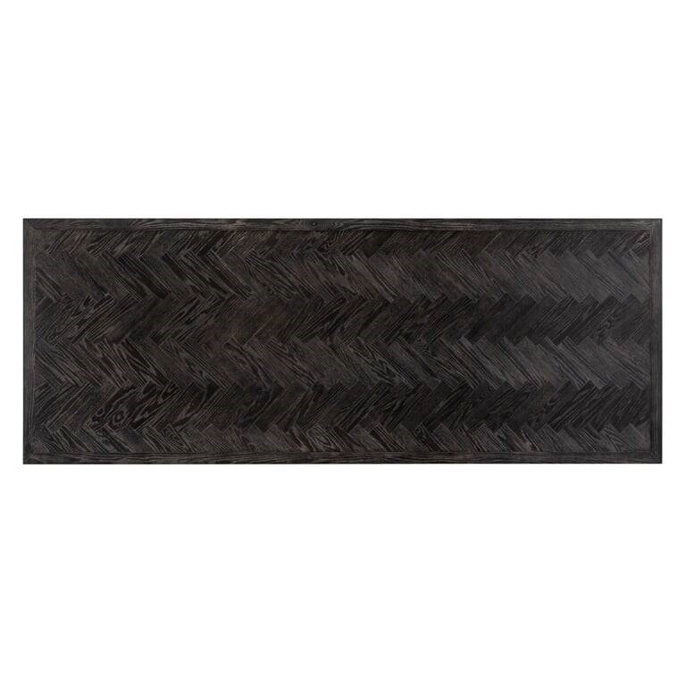 - Prostokątny blat z czarnego szlachetnego dębu w jodełkę spoczywa na solidnej mosiężnej podstawie.
