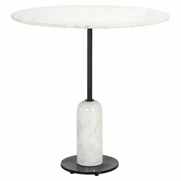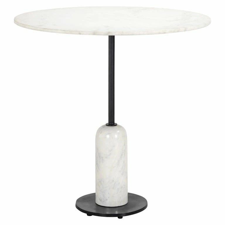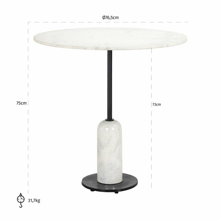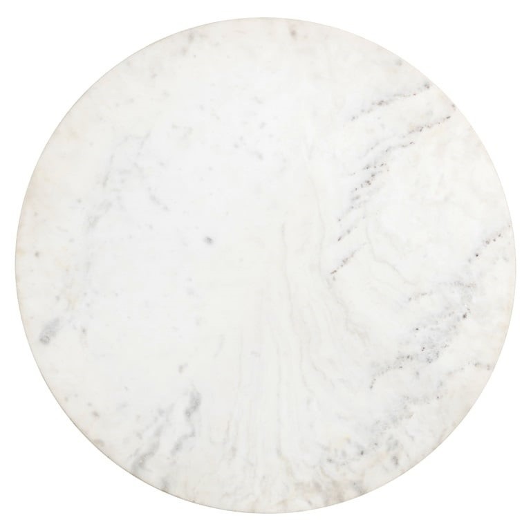 Okrągły blat zdobi piękny, elegancki marmur w białej tonacji.