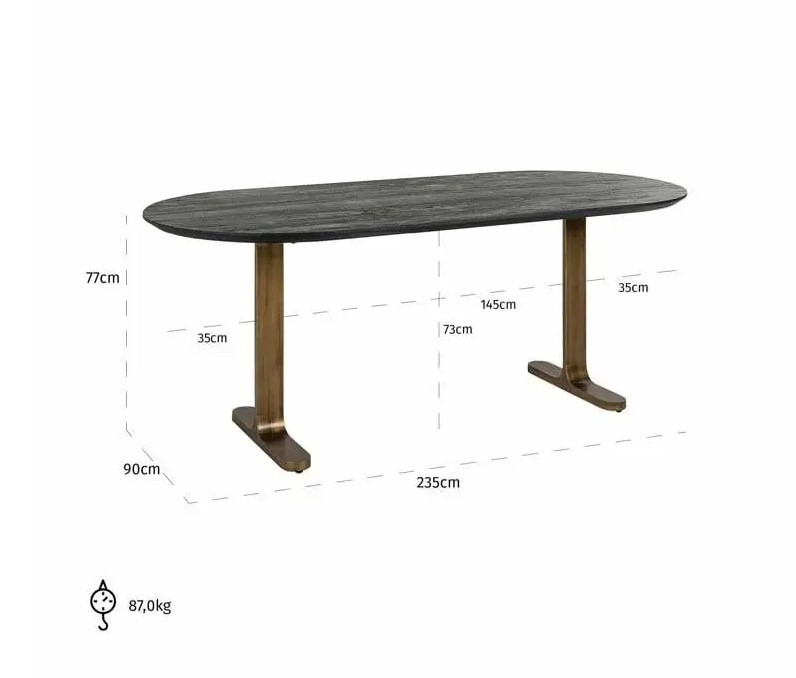 Piękny, owalny blat wykonano z drewna Mango a mosiężną podstawę ze stali w kolorze matowego złota.