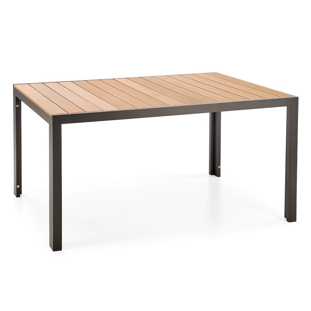 Stół FIERRO to nowoczesny mebel o kwadratowym blacie, idealny do przestrzeni ogrodowych, tarasów czy balkonów. Konstrukcja stołu wykonana jest z aluminium, zapewniającym lekkość oraz odporność na warunki atmosferyczne. Blat z polistyrenu imituje naturalne drewno, łącząc estetykę z trwałością materiału. Dzięki zastosowaniu wysokiej jakości materiałów, stół FIERRO jest odporny na działanie czynników zewnętrznych, takich jak deszcz czy promieniowanie UV, co gwarantuje jego długowieczność. Minimalistyczny design i stonowana kolorystyka sprawiają, że stół doskonale komponuje się z różnorodnymi aranżacjami ogrodowymi.