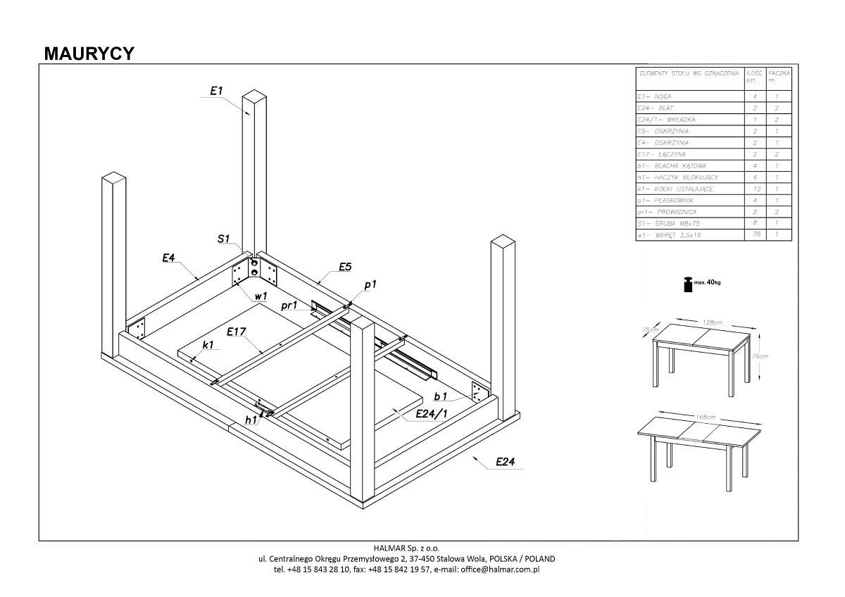 MAURYCY to uniwersalny i funkcjonalny stół rozkładany. Charakteryzuje się pięknym designem, prostą formą i solidnym wykończeniem. Sprawdzi się w salonie lub jadalni podczas rodzinnych spotkań i okazyjnych imprez. Posiada mechanizm umożliwiający wydłużenie powierzchni stołu do 158 cm. Balat wykonano z płyty laminowanej następnie wykończono tworzywem ABS. Nogi stworzono z laminowanej płyty MDF.