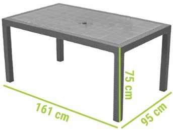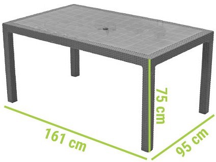 Duży stół ogrodowy o wymiarach: 161 x 95 x 75 cm, przeznaczony dla 6-8 osób. Wykonany z wytrzymałego polipropylenu w kolorze cappuccino. Jest materiałem wysoce odpornym na warunki atmosferyczne, wodę i promieniowanie UV. Stół może być używany na zewnątrz w sezonie wiosenno-letnim. Nogi i krawędzie blatu zdobi efektowna faktura imitująca naturalną tkaninę rattanową, a sama powierzchnia blatu jest gładka. Pośrodku otwór o średnicy - cm na cień ogrodowy. Stół wymaga samodzielnego montażu - wystarczy przymocować nogi do blatu.