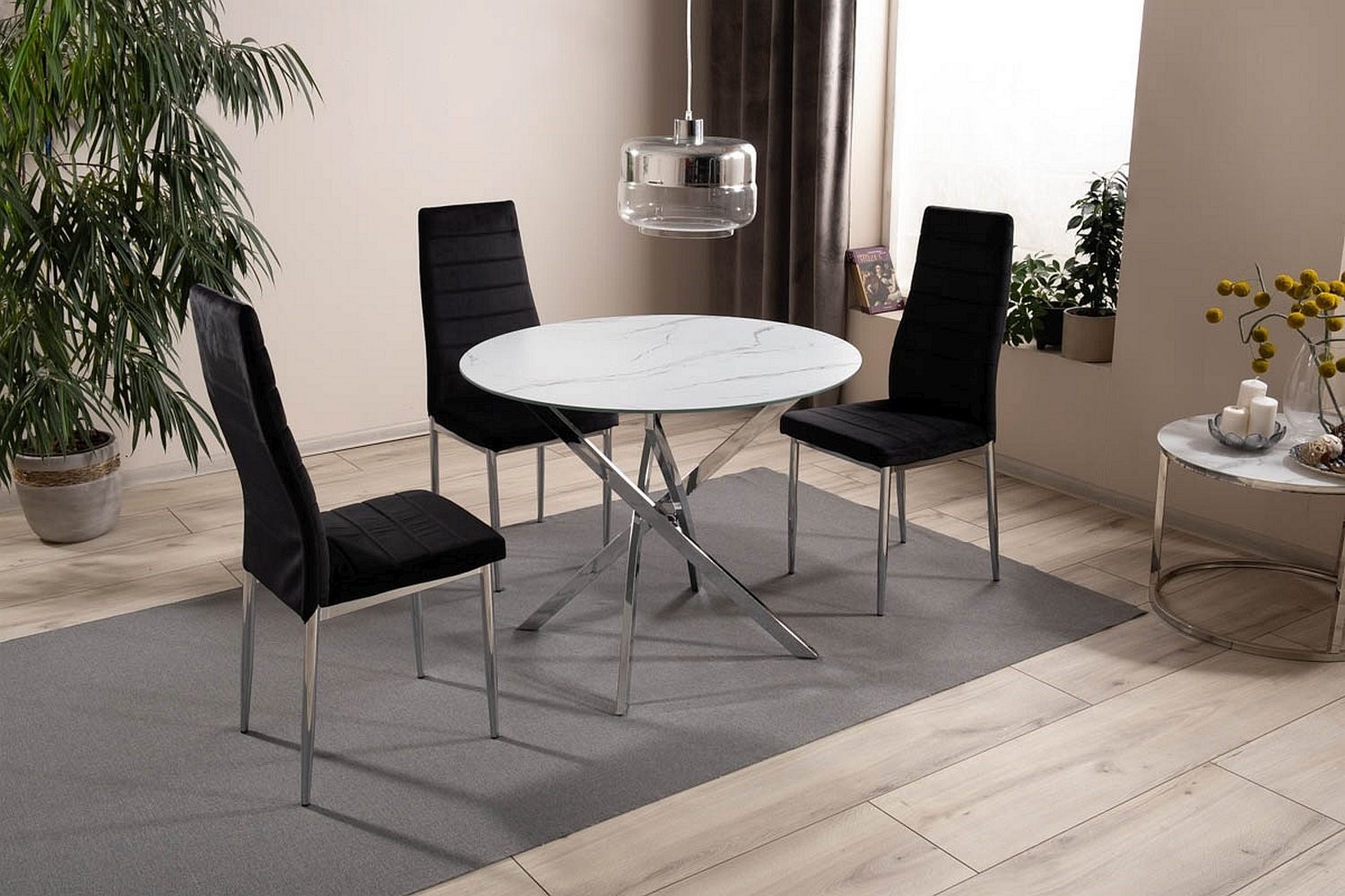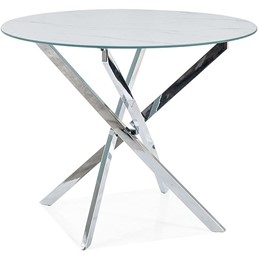 Stół Agis to propozycja dla osób, które cenią sobie nowoczesne wzornictwo i funkcjonalność. Powstał z połączenia połyskującego blatu w efekcie marmuru oraz chromowanej podstawy. Został wykonany z trwałych materiałów, gwarantujących mu długą żywotność. Jego biała barwa świetnie wpasuje się w wystrój wnętrz w stylu skandynawskim, industrialnym, nowoczesnym, czy minimalistycznym. Blat stołu Agis pomieści cztery osoby, a jego okrągła forma sprawia, że doskonale sprawdzi się jako stół jadalniany, czy dekoracyjny.