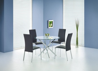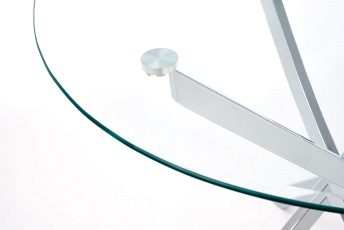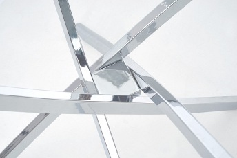 RAYMOND to nowoczesny design i ciekawa forma, która będzie ciekawym i gustownym elementem dekoracyjnym w domu. Idealny do nowoczesnej jadalni lub salonu. Okrągły, szklany, bezbarwny blat nie pomniejszy przestrzeni, w której się znajdzie. Oryginalnie skrzyżowane nogi zostały wykonane ze stali chromowanej.
