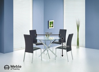 Stół dostępny z wersji kolorystycznej z bezbarwnym szklanym blatem i stalowymi chromowanymi nogami.