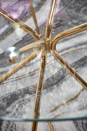 - Piękny transparentny blat ze szkła doskonale komponuje się ze stelażem i nogami w złotym kolorze, dzięki czemu całość wyróżnia się, jak diament na tle innych elementów wyposażenia.