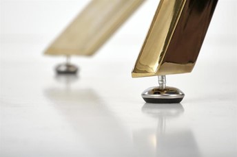 Stół RAYMOND 2 to nowoczesny stół do salonu lub jadalni. Okrągły stół 100x100 posiada ozdobną ramę z chromowanej stali w ciekawym złotym kolorze, natomiast blat wykonany jest ze szkła i białego marmuru. Stół przekonuje swoim urokiem, a lśniący spód designu zwraca uwagę. Stół RAYMOND 2 jest idealny do stylu glamour.