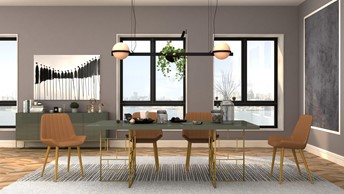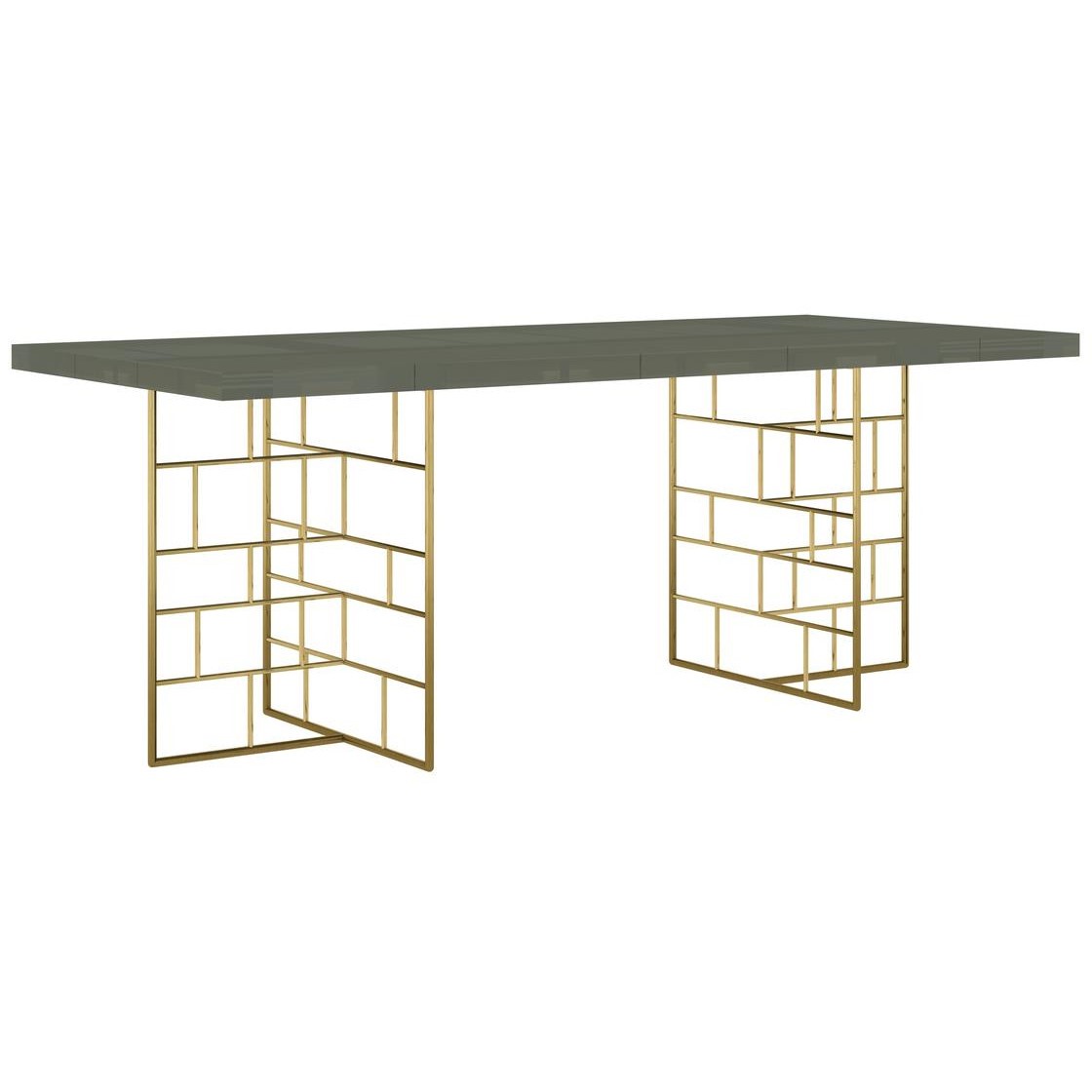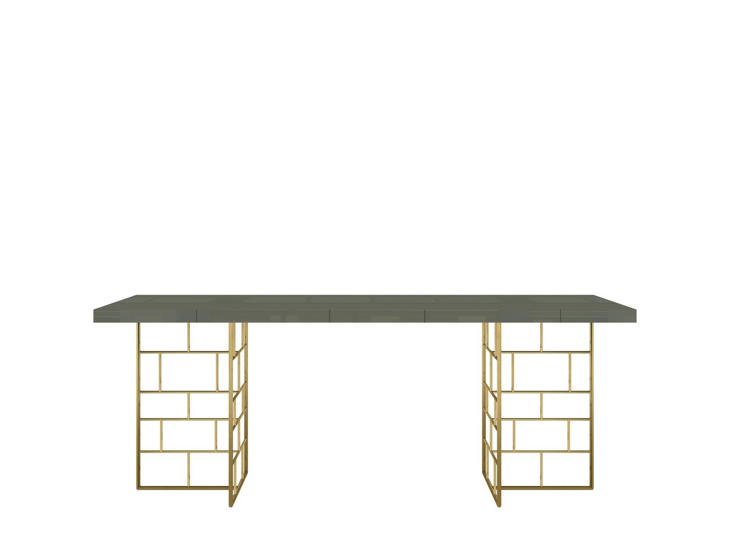 Stół w stylu modern classic z blatem w kolorze cementowej zieleni i kontrastującymi nogami w oryginalnym geometrycznym wzorze w kolorze złota wykonanymi ze stali nierdzewnej to połączenie elegancji i nowoczesności. Jego minimalistyczna forma bryły tworzy harmonijną całość, wprowadzając do przestrzeni subtelną estetykę. Blat stołu wykonany z płyty MDF na wysoki połysk dodaje mu elegancji i wyrafinowania, podczas gdy oryginalny geometryczny wzór na nogach nadaje mu unikalnego charakteru. Kontrastujące kolory i materiały tworzą interesującą kompozycję, która ożywia przestrzeń.