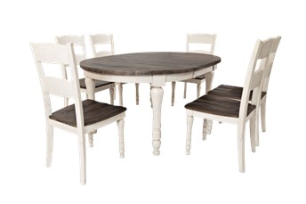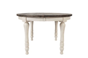 Elegancki, drewniany stół rozkładany z regenerowanej naturalnej sosny w kolorze kremowo-brązowym z ozdobnymi ryflowanymi nogami.