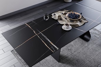 Stół Diuna Ceramic to mebel o nowoczesnym designie, który doskonale wpasuje się do wielu wnętrz. Blat wykonany jest z wysokiej jakości materiałów, takich jak szkło hartowane i ceramika włoska SAHARA NOIR. Stół posiada blat w kolorze czarnym. Dodatkowo blat posiada wykończenie w postaci powłoki ceramicznej, która jest wytrzymała na wysokie temperatury i łatwa w utrzymaniu czystości. Stół Diuna Ceramic posiada regulowaną szerokość, dzięki czemu można go rozłożyć do szerokości 240 cm. Mebel posiada także nietuzinkowy czarny matowy stelaż, który nadaje mu elegancki wygląd. Stolik będzie dopełnieniem każdego salonu czy też jadalni dodając jej charakteru.