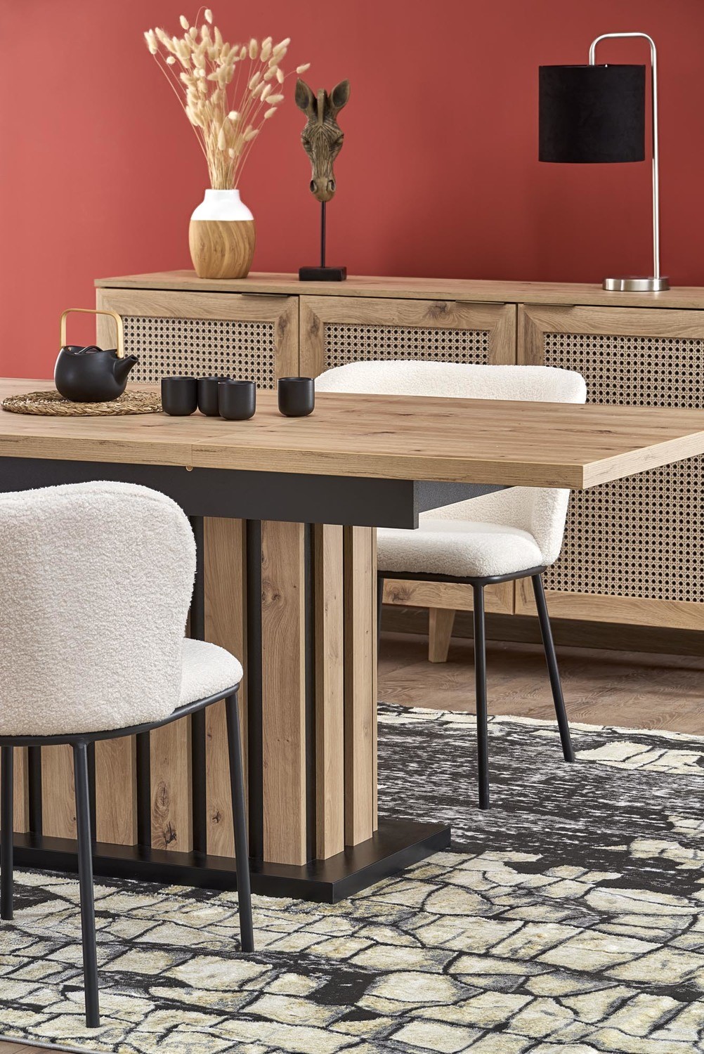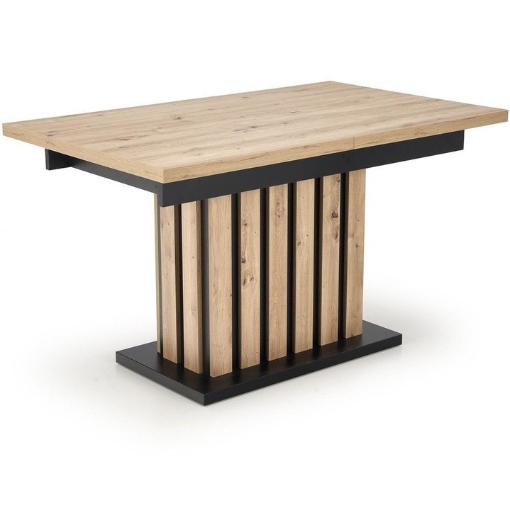 Stół Lamello to nie tylko mebel, ale również elegancki element dekoracyjny, który nadaje Twojemu wnętrzu wyjątkowego charakteru. Wykonany z wysokiej jakości płyty laminowanej w kolorze dąb artisan oraz czarnym, prezentuje się nowocześnie i stylowo. Kombinacja tych dwóch kolorów dodaje pomieszczeniu ciepła i klasy, tworząc przyjemną atmosferę. Jego rozkładana konstrukcja sprawia, że łatwo dostosujesz go do swoich potrzeb, bez względu na ilość gości. Funkcjonalność idzie tu w parze z estetyką, a zdobne lamele na masywnej nodze nadają stołowi wyjątkowego charakteru. Stół Lamello nie tylko spełni Twoje oczekiwania pod względem funkcjonalności, ale także podkreśli gustowny wystrój Twojego domu