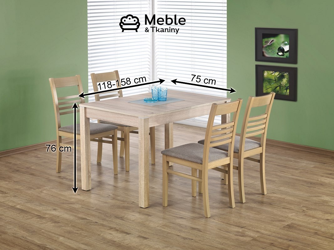 MAURYCY to uniwersalny i funkcjonalny stół rozkładany. Charakteryzuje się pięknym designem, prostą formą i solidnym wykończeniem. Sprawdzi się w salonie lub jadalni podczas rodzinnych spotkań i okazyjnych imprez. Posiada mechanizm umożliwiający wydłużenie powierzchni stołu do 158 cm. Balat wykonano z płyty laminowanej następnie wykończono tworzywem ABS. Nogi stworzono z laminowanej płyty MDF.