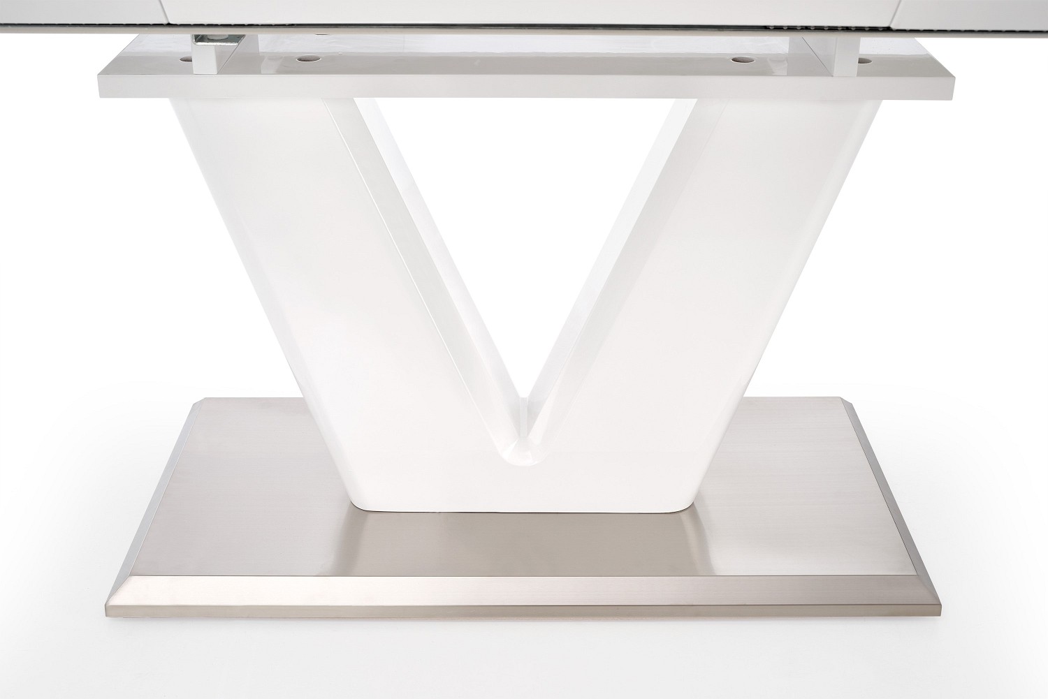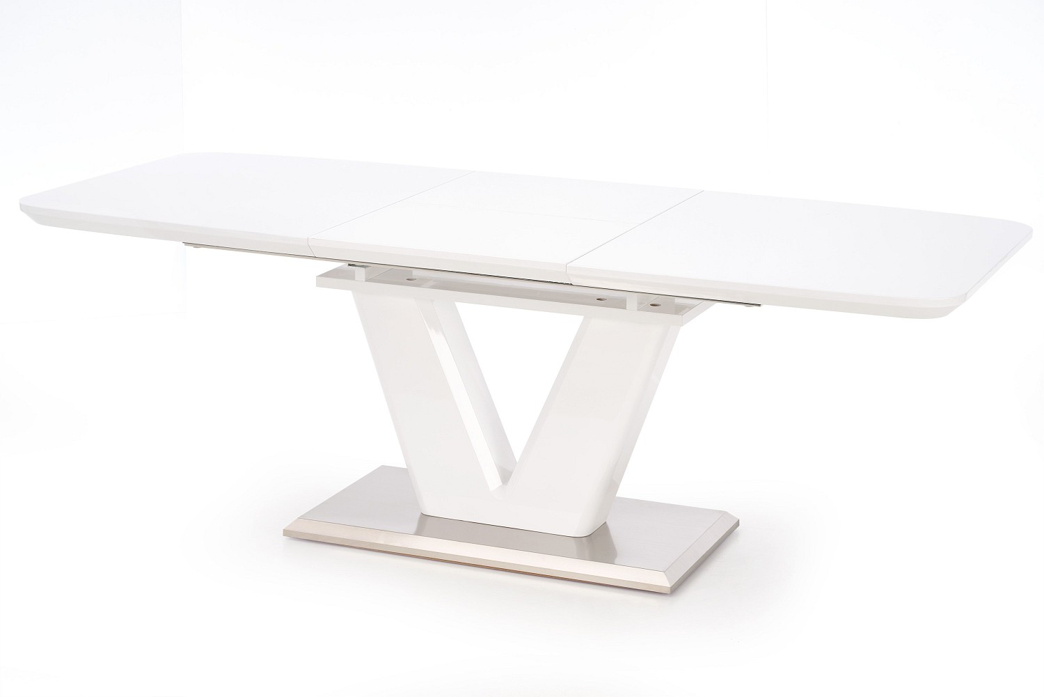 Stół Mistral to propozycja dla wszystkich tych, którzy cenią sobie nowoczesność bez uszczerbku na funkcjonalności. Unikatowa podstawa w kształcie litery v wykonana została z połączenia stali nierdzewnej z lakierowaną płytą MDF. Biały, odbijający światło blat spełnia funkcję nie tylko ozdobną, ale też praktyczną – łatwo utrzymać jest go w czystości. Dodatkowym atutem stołu jest możliwość regulacji jego długości. Tym samym doskonale sprawdzi się on zarówno na kameralnych, jak i większych spotkaniach.