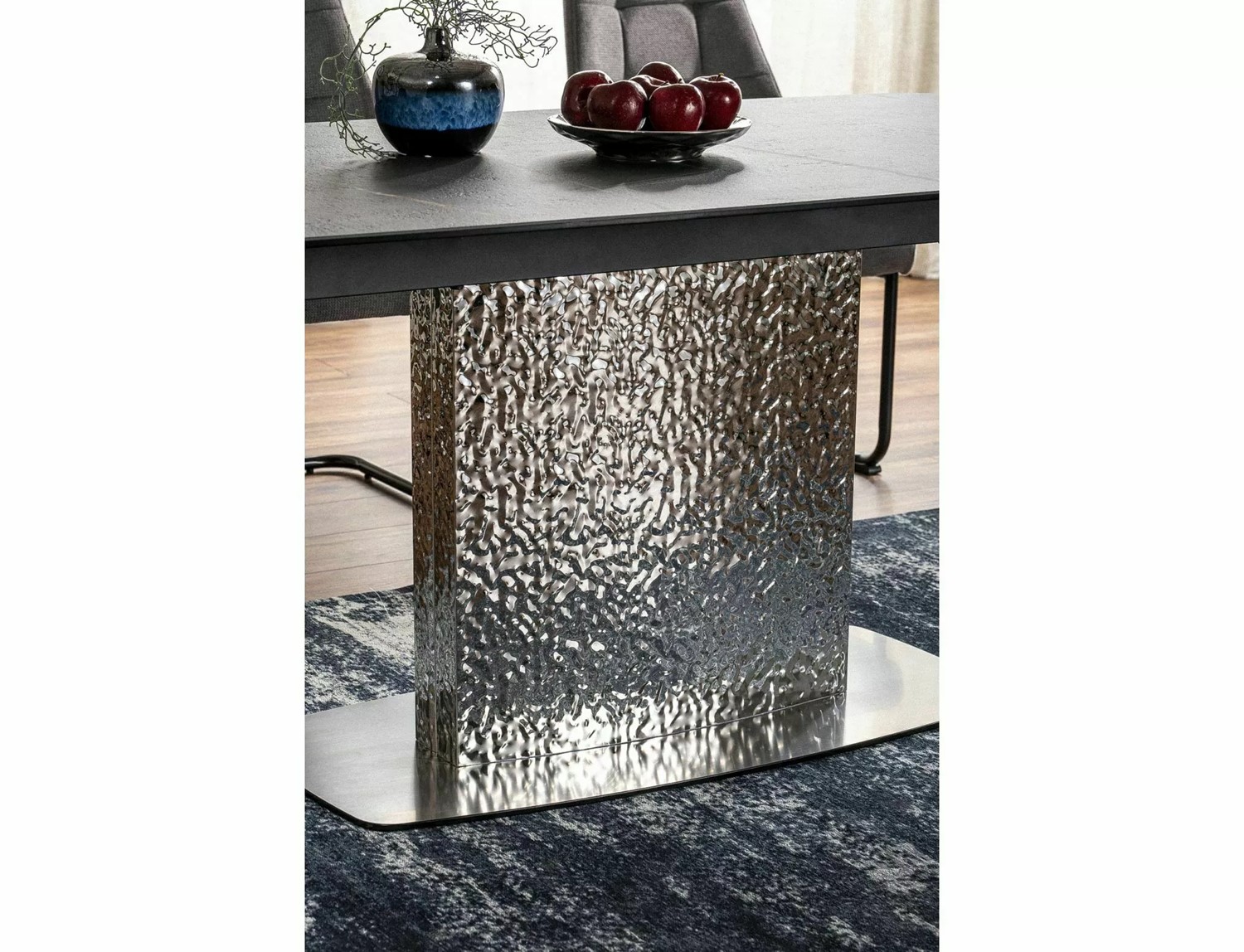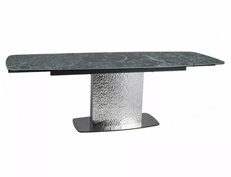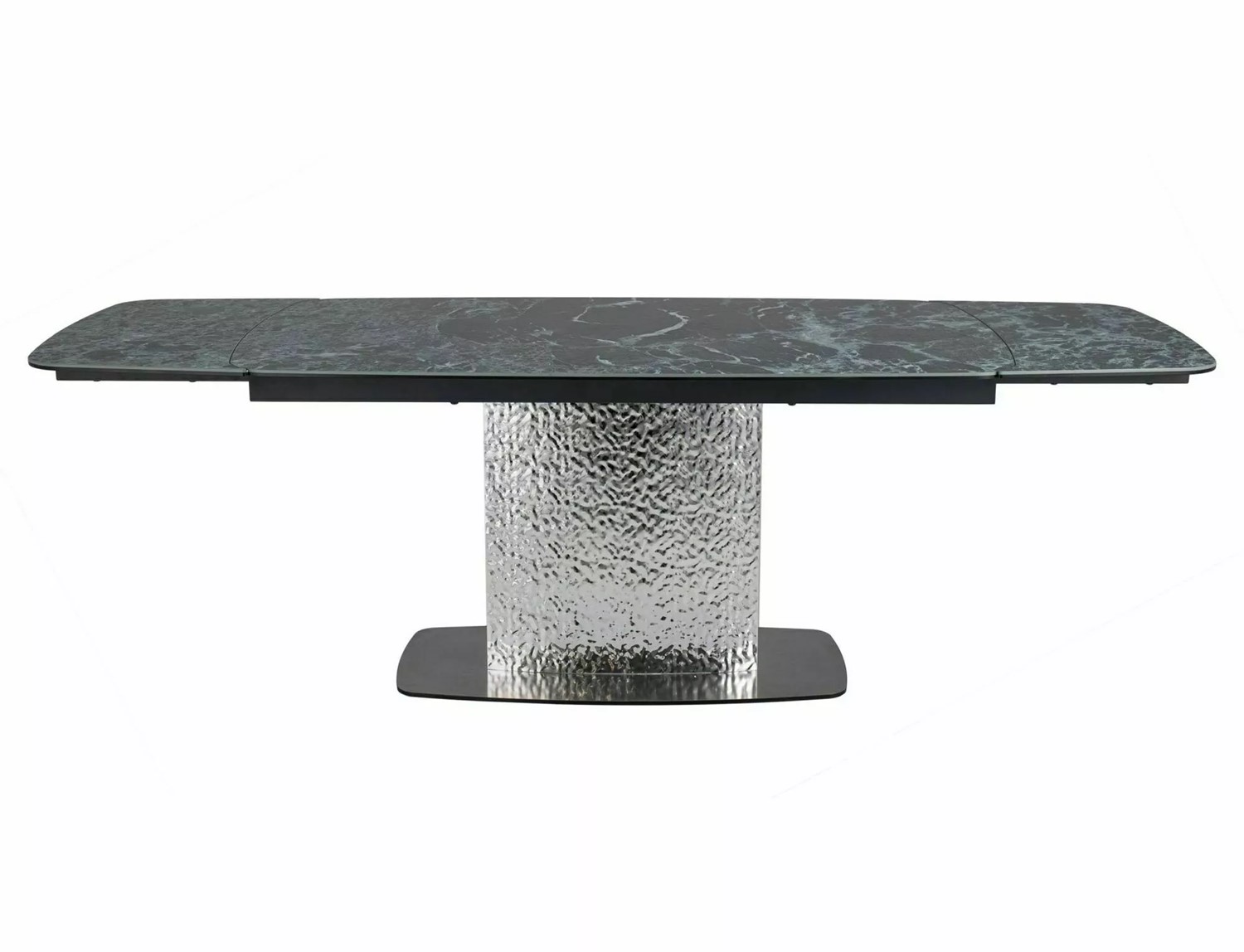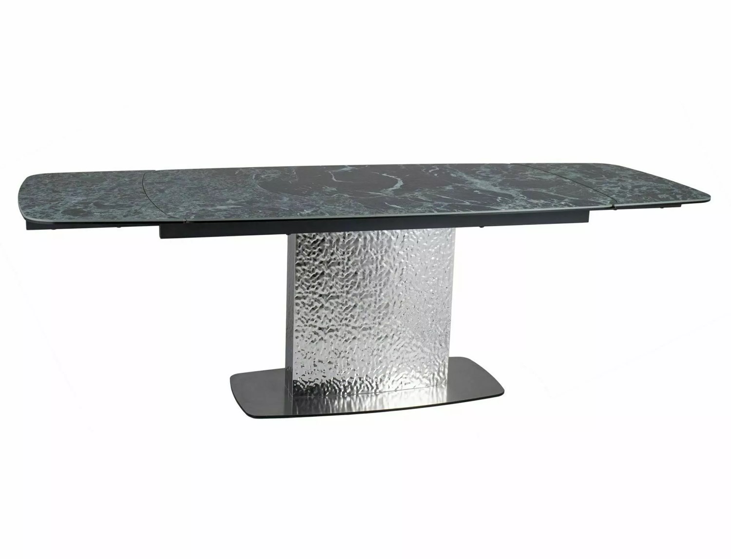 Rozkładany stół o wymiarach (160-240)x90 cm to unikalne połączenie elegancji i funkcjonalności. Blat z hartowanego szkła oraz ceramiki VERDE ALPI, wyróżniający się wyrafinowanym, zielonkawym odcieniem, zapewnia trwałość i stylowy wygląd. Metalowy stelaż w morskim kolorze, wzbogacony elementami ze stali nierdzewnej, nadaje meblowi nowoczesny charakter i stabilność. Dzięki funkcji rozkładania stół oferuje większą przestrzeń, idealną na przyjęcia czy rodzinne spotkania. To doskonały wybór do współczesnych wnętrz, dodający im elegancji i wyjątkowości.