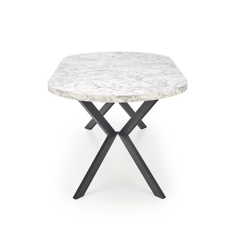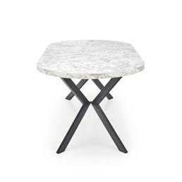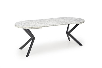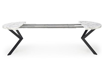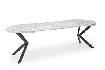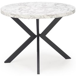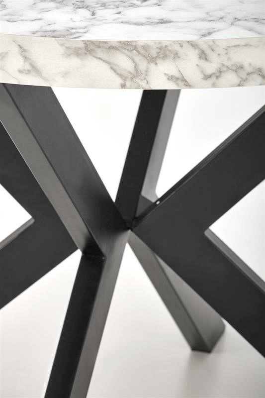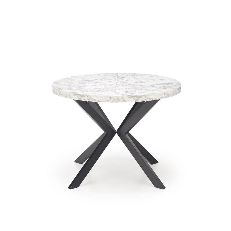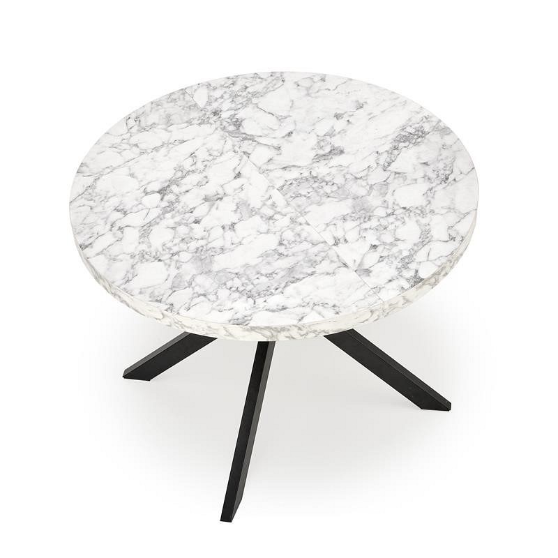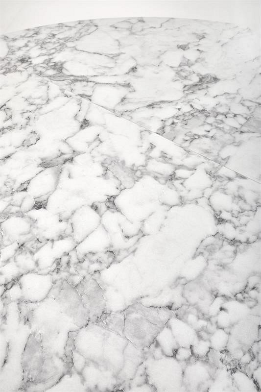 Okrągły rozkładany stół PERONI stanie się wspaniałym elementem wnętrz w stylu loft. Blat stołu wykonany jest z okleiny z białego marmuru, a nogi ze stali malowanej proszkowo na czarno. Okrągły blat można rozłożyć do 250 cm, dzięki czemu jest praktyczny i funkcjonalny. Metalowe nogi wygięte lekko do środka w kształcie litery X zapewniają meblom stabilność i wytrzymałość. Stół rozkładany PERONI to idealne rozwiązanie do mieszkań i domów, które nie wymagają na co dzień dużej ilości miejsca wokół stołu i gdzie stół można złożyć tylko w różnych sytuacjach. Dzięki temu stoły do jadalni i salonu zajmują mniej miejsca w domu.