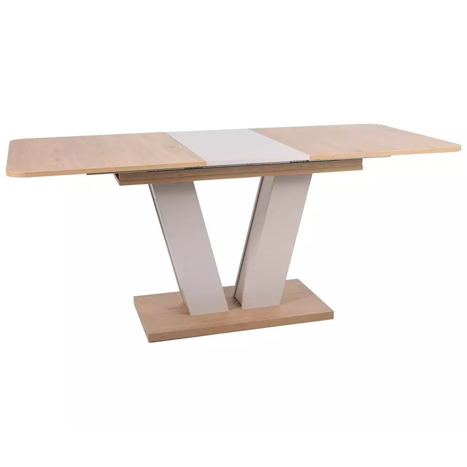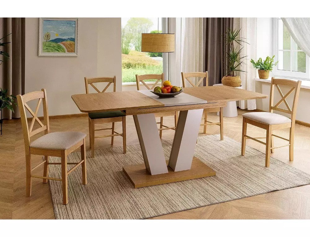 Prezentowany stół to stylowe i praktyczne rozwiązanie do jadalni, salonu lub przestrzeni dziennej. Charakteryzuje się nowoczesnym designem, który łączy elegancję z funkcjonalnością. Stabilna podstawa zapewnia komfort użytkowania i solidność konstrukcji. Stół wyposażony jest w funkcję rozkładania, dzięki czemu łatwo dostosować go do liczby domowników lub gości. Prosta forma oraz uniwersalna kolorystyka sprawiają, że mebel łatwo dopasować do różnych aranżacji wnętrz – od klasycznych po nowoczesne.