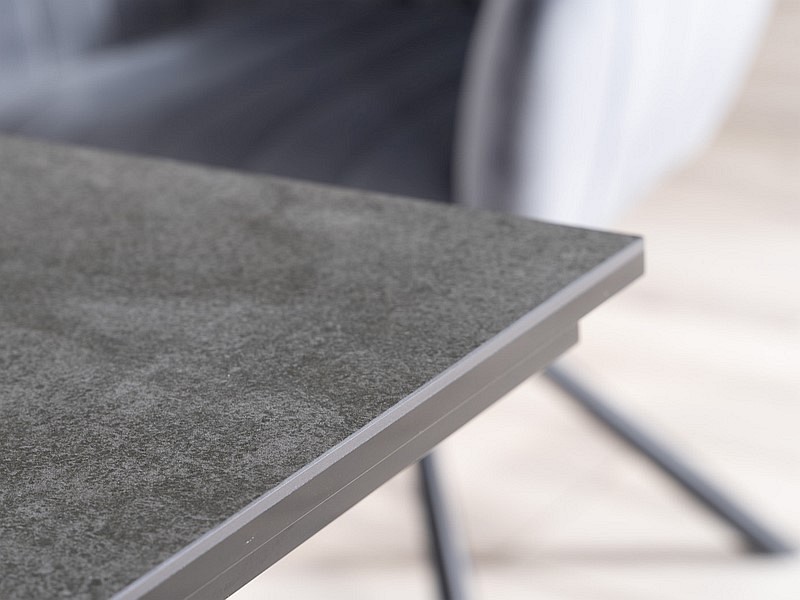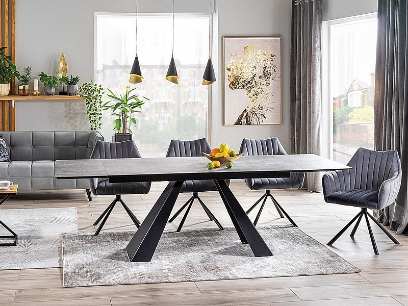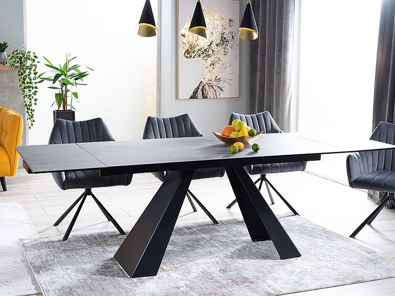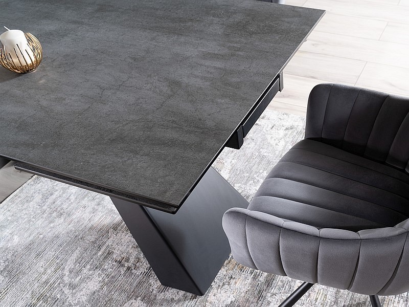 Ten stół to idealne połączenie klasycznego i nowoczesnego stylu. Nogi wykonanne został z metalu, a blat została to połączenia szkła hartowanego z cermaiką a dodatkowo charakteru dodaję ceramika w kolorze Szarego Marmuru. Dzięki dwóm wkładkom stół może zwiększyć swoją szerokośc ze 180cm do 260cm, co idealnie sprawdzi się, jeżeli będzie potrzebne więcej miejsca przy stole. Stół dzięki niesamowitemu wyglądowi będzie pasować do każdego wnętrza. Jest to idealny mebel do salonu lub jadalni, aby dodać pomieszczeniu ciepła i przytulności.