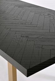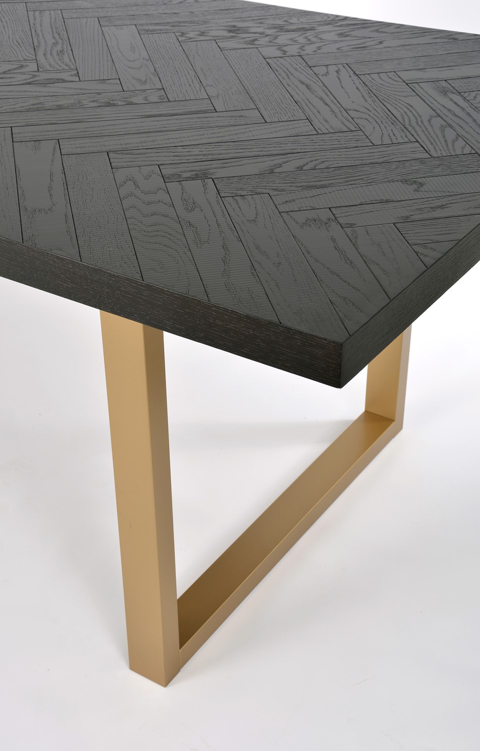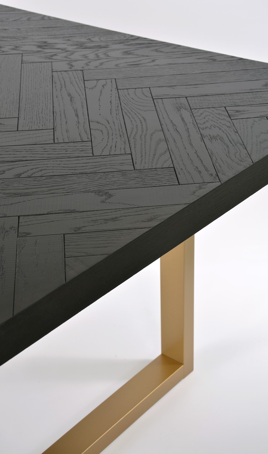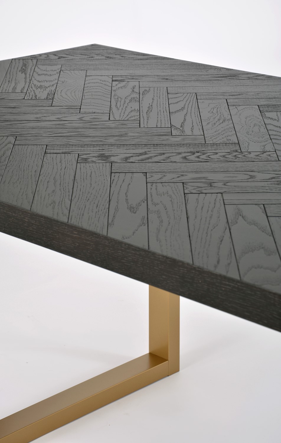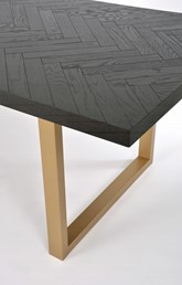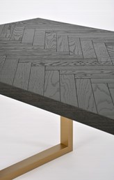 Oryginalny stół wykonany z drewna bukowego, nawiązujący do stylu nowoczesnego, retro i glamour. Blat z inkrustacją w jodełkę jest czarny z połyskiem. Nogi w kształcie litery U są w kolorze półmatowego złota i wykonane z litego dębu.