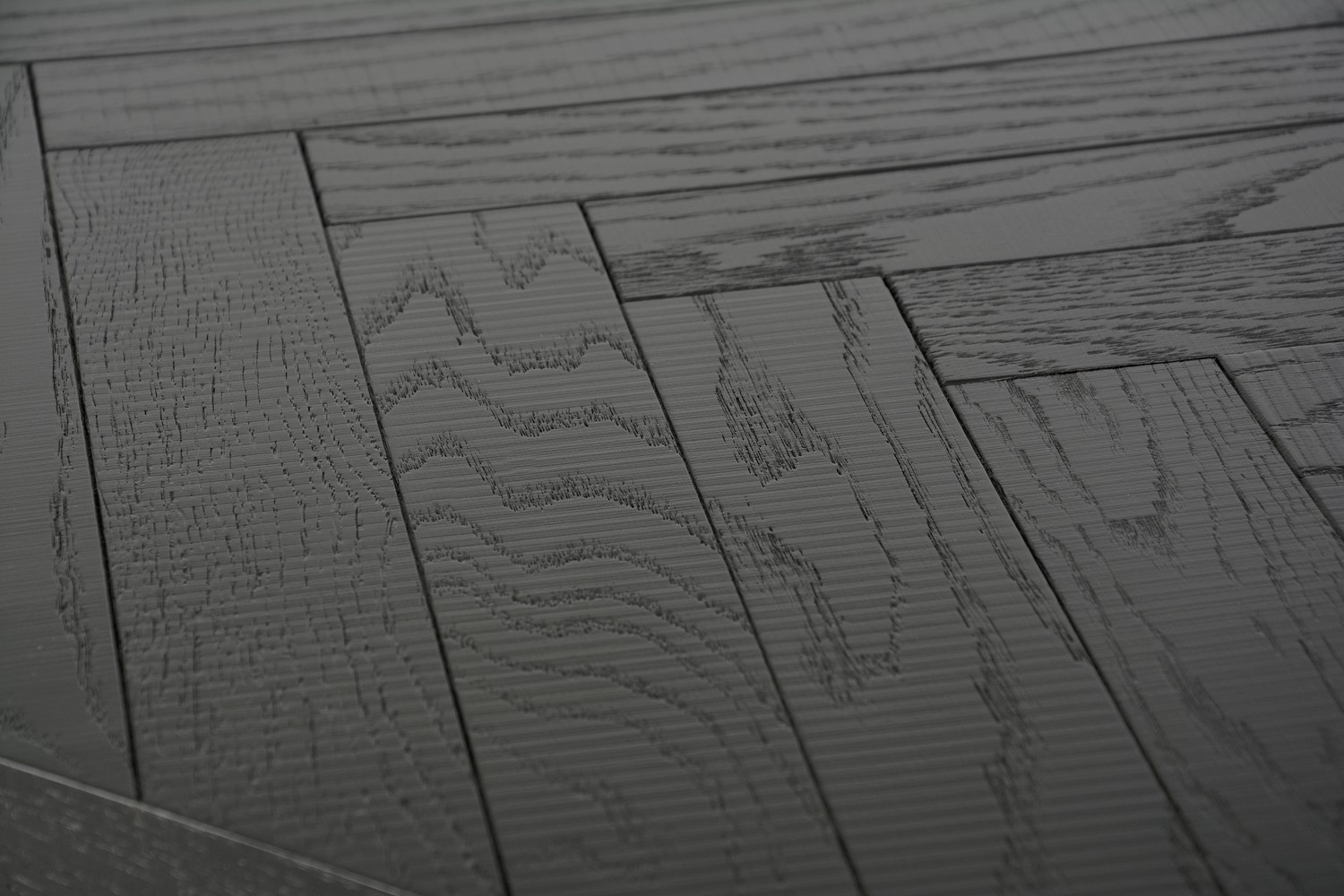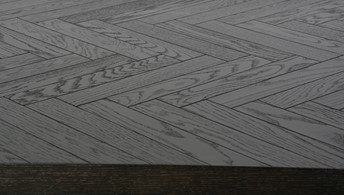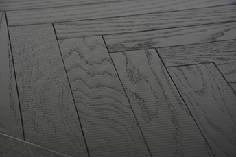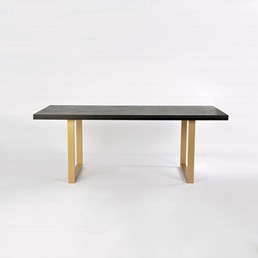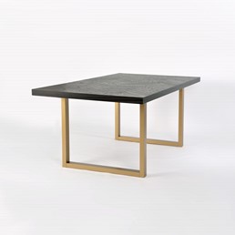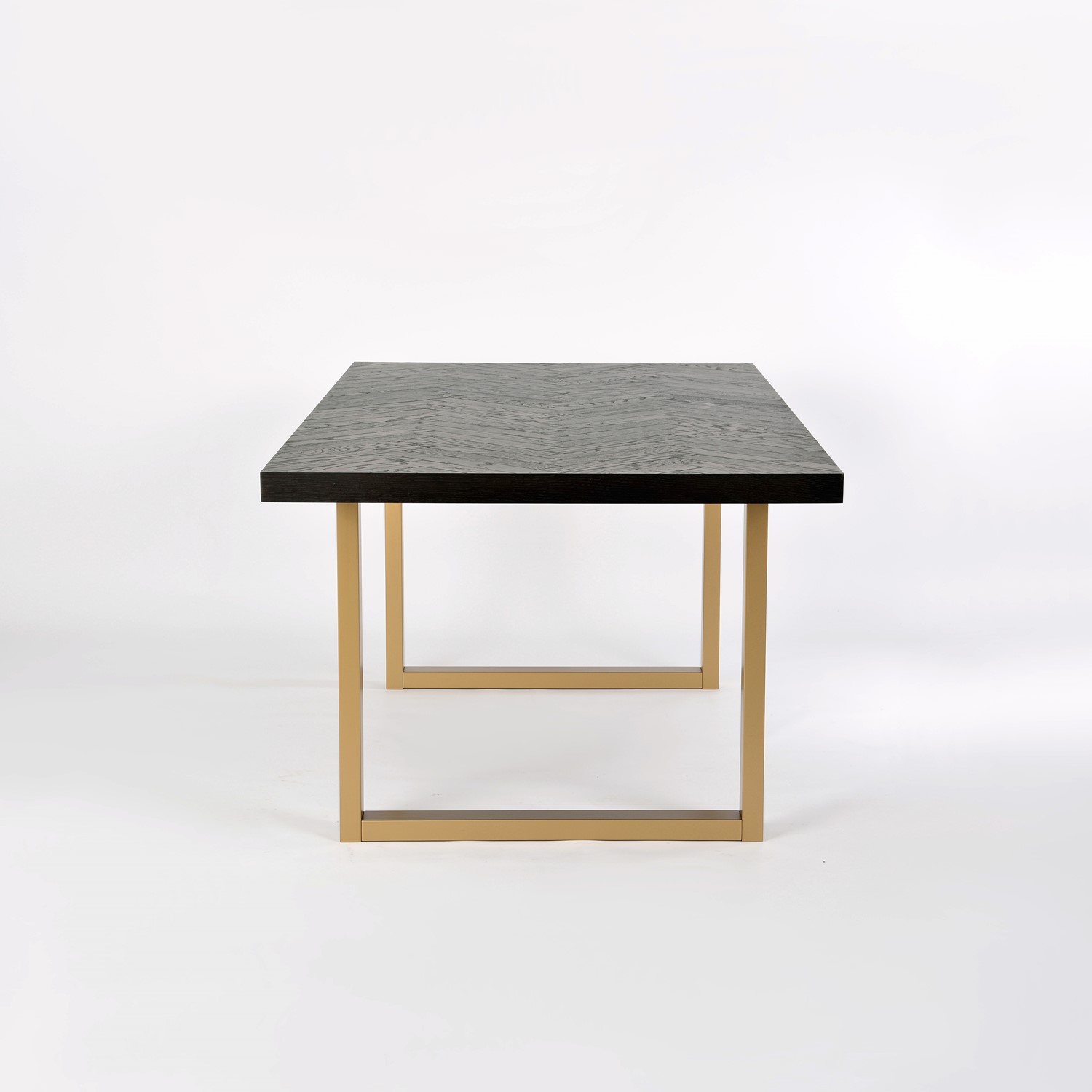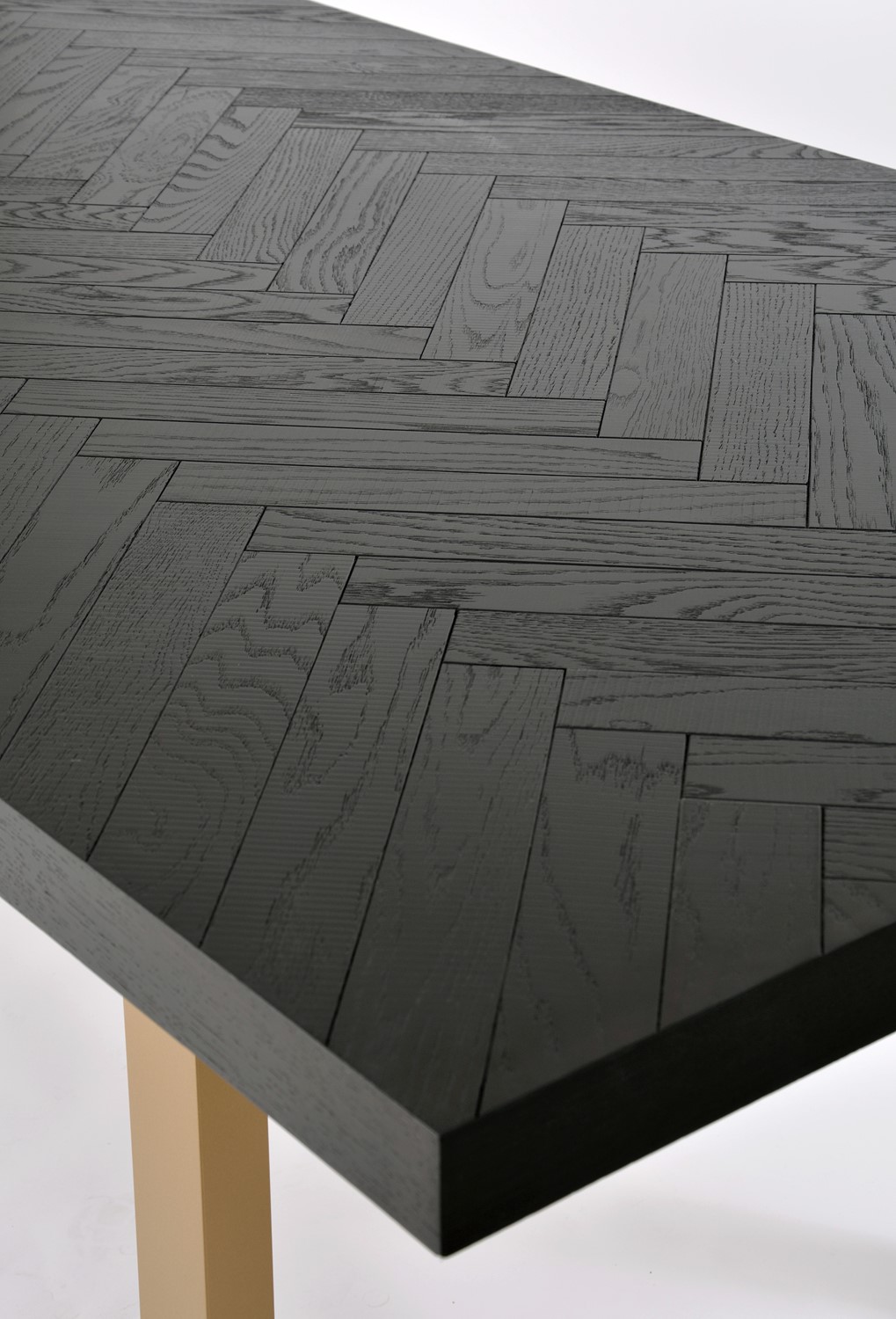 Oryginalny stół wykonany z drewna bukowego, nawiązujący do stylu nowoczesnego, retro i glamour. Blat z inkrustacją w jodełkę jest czarny z połyskiem. Nogi w kształcie litery U są w kolorze półmatowego złota i wykonane z litego dębu.