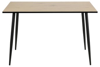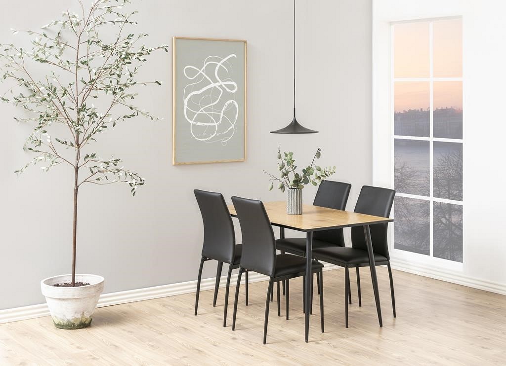 Stół Wilma to połączenie blatu z dzikiego dębu z metalową podstawą. Blat z forniru dębowego doskonale komponuje się z malowaną proszkowo i matową, metalową podstawą w kolorze czarnym. Natomiast boki blatu okleinowane są kolorem i fakturą czarnego dębu. Stół doskonale sprawdzi się w każdym wnętrzu. Nadaje się zarówno do przestrzeni hotelowej, gastronomicznej, jak i jadalni czy salonu domu.
