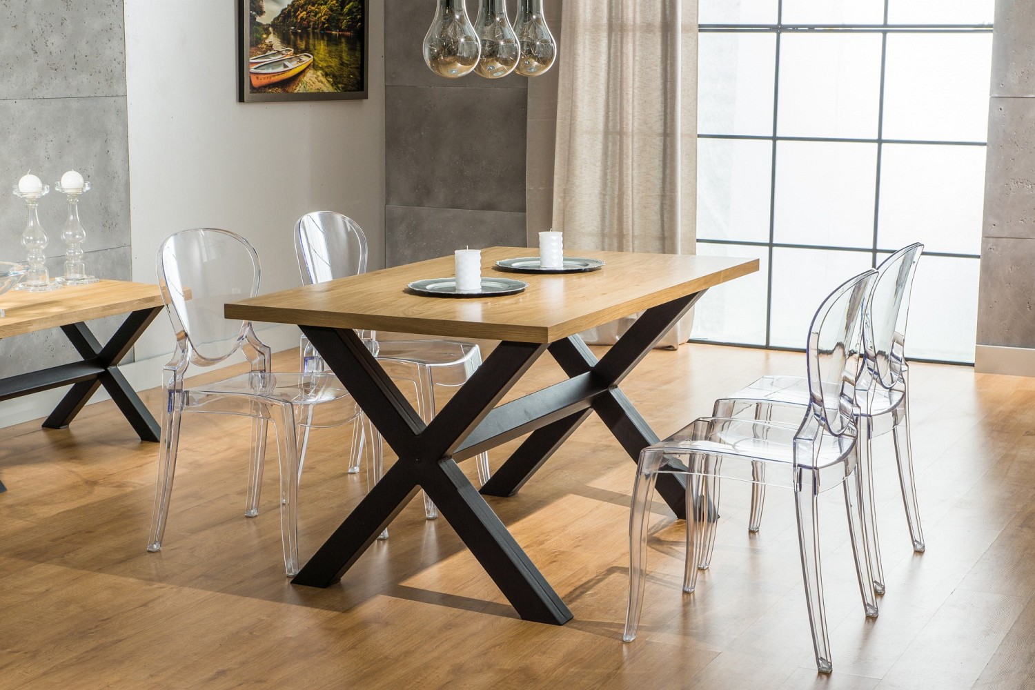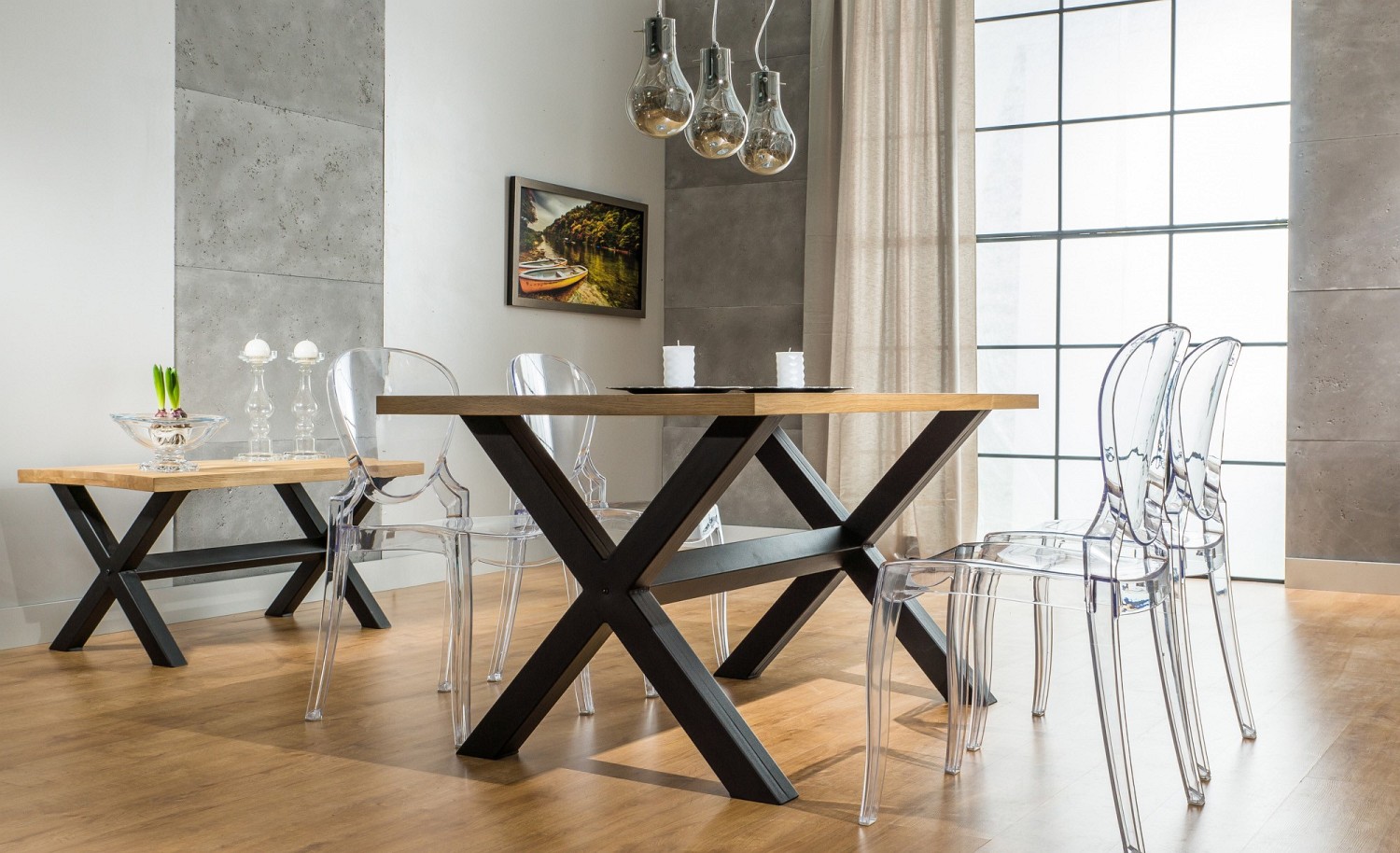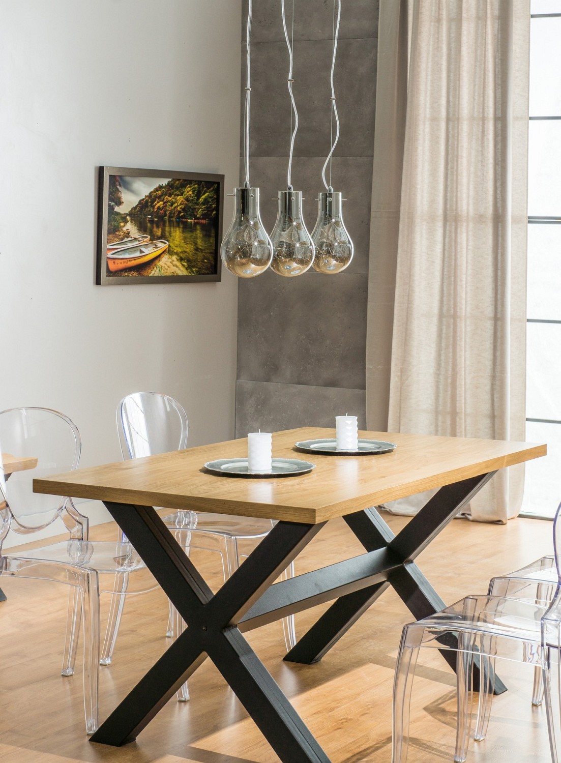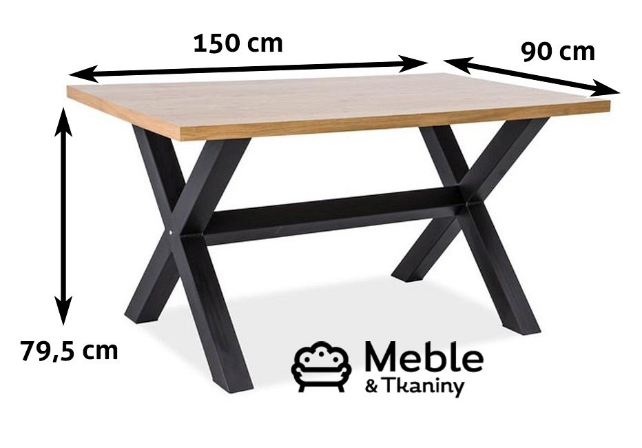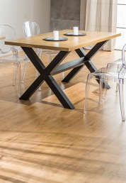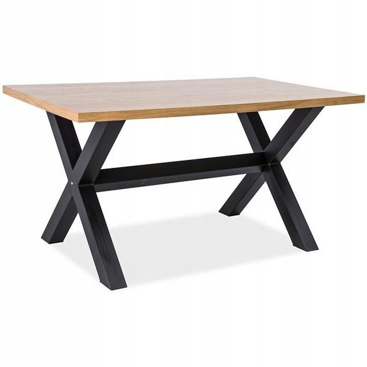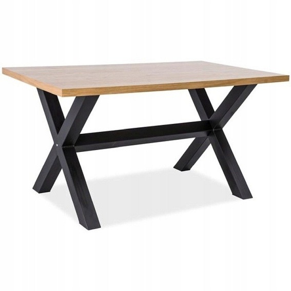 XAVIERO to reprezentant stylu loftowego. Blat jest wykonany okleiny naturalnej. Masywne nogi krzyżują się w połowie podstawy i posiadają dodatkowy wspornik w miejscu przecięcia. Stelaż pomalowany jest na kolor czarny.