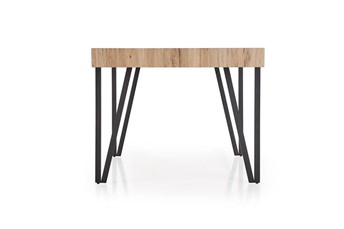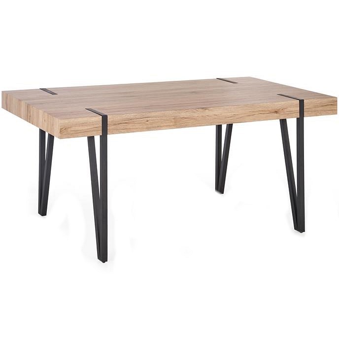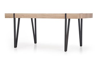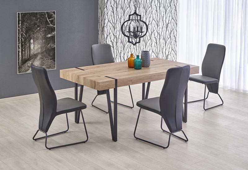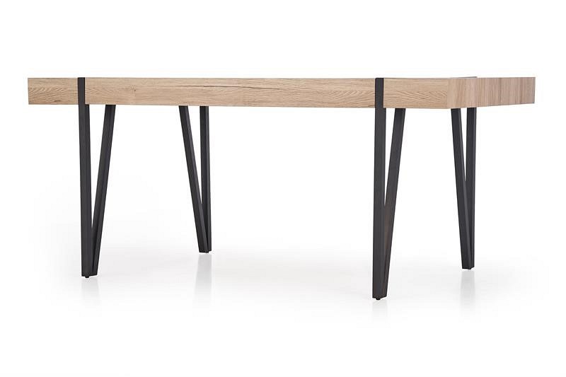 Stół Yohann w jadalni i salonie Halmar ma blat z płyty MDF laminowanej dębem San Remo i podstawę ze stali malowanej proszkowo na czarno. Malowanie proszkowe zapewnia wyjątkową trwałość koloru, malowane elementy nie są podatne na rdzę i uszkodzenia. Blat o wysokości 10 cm wykonany z laminowanej płyty MDF jest odporny na wysokie temperatury, tarcie i zarysowania, a także jest łatwy w czyszczeniu. Połączenie drewnianego blatu i metalowych nóg to atrakcyjny duet dla loftowego stylu.