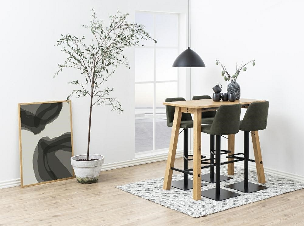 Stołek barowy Avanja to propozycja do modnych i wysokich wysp kuchennych lub barów. Hoker został zrobiony z tapicerowanego siedziska oraz metalowej podstawy. Materiał użyty na siedzisku to Preston fabric olive zielony 38. Jest to wytrzymała tkanina w stonowanym uniwersalnym kolorze. Siedzisko zostało zrobione również z wyprofilowanego oparcia. Metalowa podstawa stolika została pomalowana proszkowo na czarno. Podstawa składa się z jednej nogi. Dużym plusem jest regulacja wysokości podstawy za pomocą uchwytu pod siedziskiem. Kolejnym plusem stołka jest podnóżek, dzięki któremu łatwo możemy usiąść na stołku oraz wygodnie możemy oprzeć nogi.
