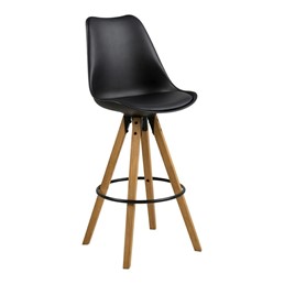 Praktyczny i komfortowy stołek barowy Dima. Wygodny stołek w stonowanej kolorystyce i nowoczesnym stylu ma obiteczarną eko skórą siedzisko i drewnianą podstawę. Siedzisko jest wymodelowane wraz z oparciem jako jeden element, z dodatkową poduszką również obitą eko skórą w czarnym kolorze. Podstawa w formie czwórnogu wykonana jest z listew z drewna kauczukowego, pobejcowanego na kolor dębu i zabezpieczonego olejem. Na dole nogi stołka objęte są czarnym metalowym relingiem pełniącym funkcję podpórki pod stopy. Całość będzie doskonale wyglądać w pubie lub jako siedzisko przy wyspie w kuchni.