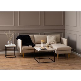 Stolik Barossa 40x40 cm w kolorze beżowego trawertynu to elegancki i funkcjonalny mebel, idealny do nowoczesnych wnętrz. Jego kwadratowy blat wykonany jest z oklejonej płyty MDF, która imituje naturalny trawertyn, nadając stolikowi wyjątkowy urok. Solidna metalowa podstawa malowana proszkowo na czarno zapewnia stabilność i trwałość.