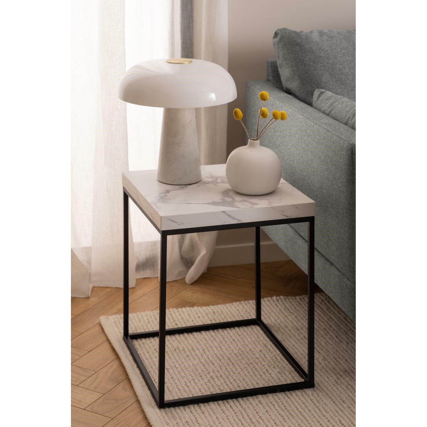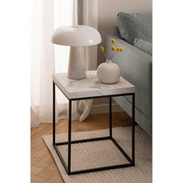 Stolik kawowy Barossa o wymiarach 40x40 cm to elegancki dodatek do każdego wnętrza. Jego blat wykonany jest z płyty MDF, która imituje biały marmur Carrara, co nadaje mu luksusowy wygląd. Podstawa stolika jest wykonana z malowanej proszkowo stali, co zapewnia stabilność i trwałość. Stolik ma wysokość 45 cm, co czyni go idealnym do ustawienia przy sofie lub fotelu.