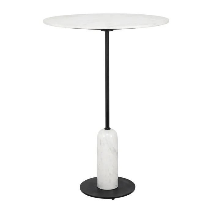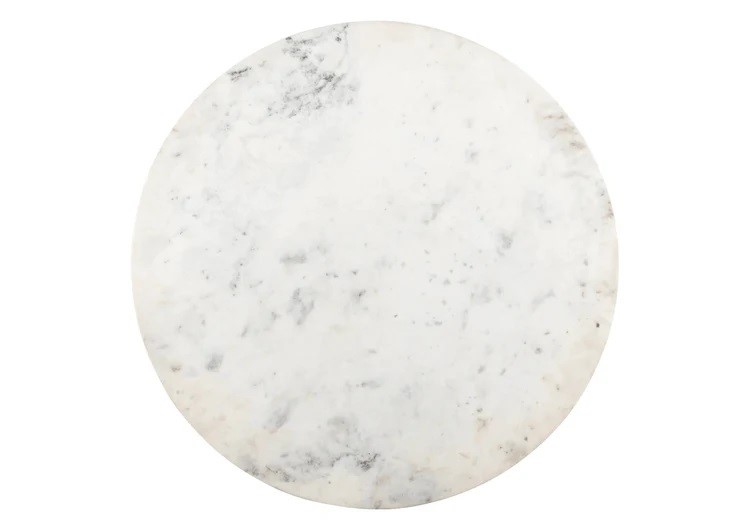 Okrągły blat zdobi piękny, elegancki marmur w białej tonacji.