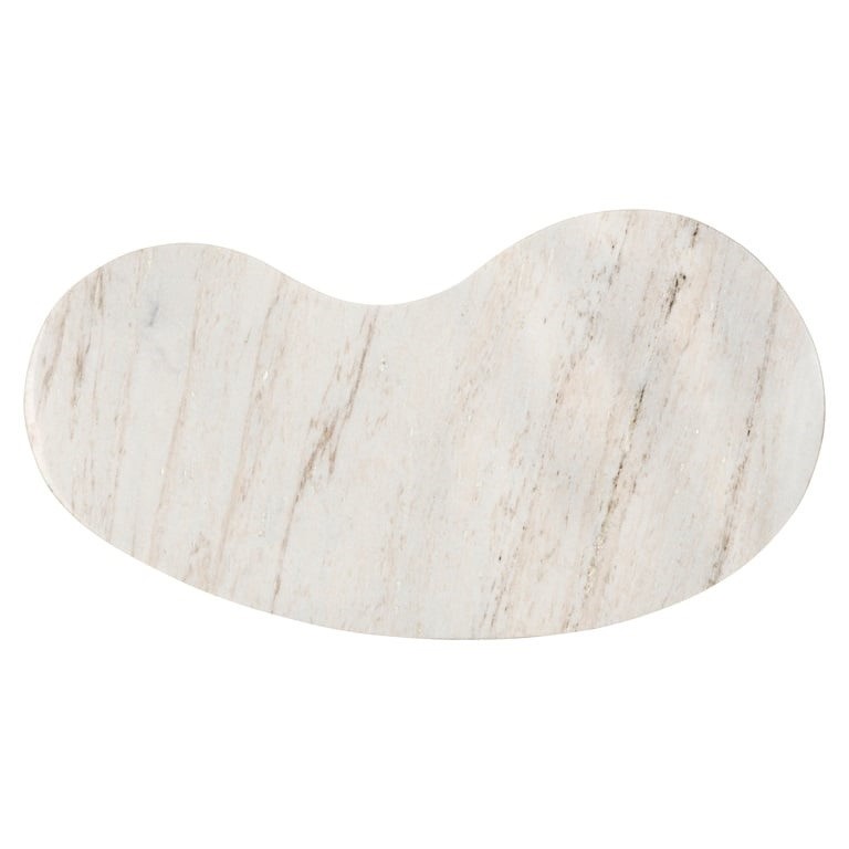 Piękny, owalny blat zdobi biały marmur, a podstawę o ciekawym kształcie drewniane lamele.