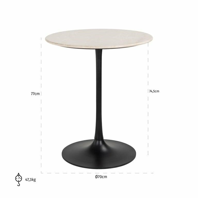 - Okrągły blat z jasnego marmuru, który nadaje stolikowi luksusowy wygląd