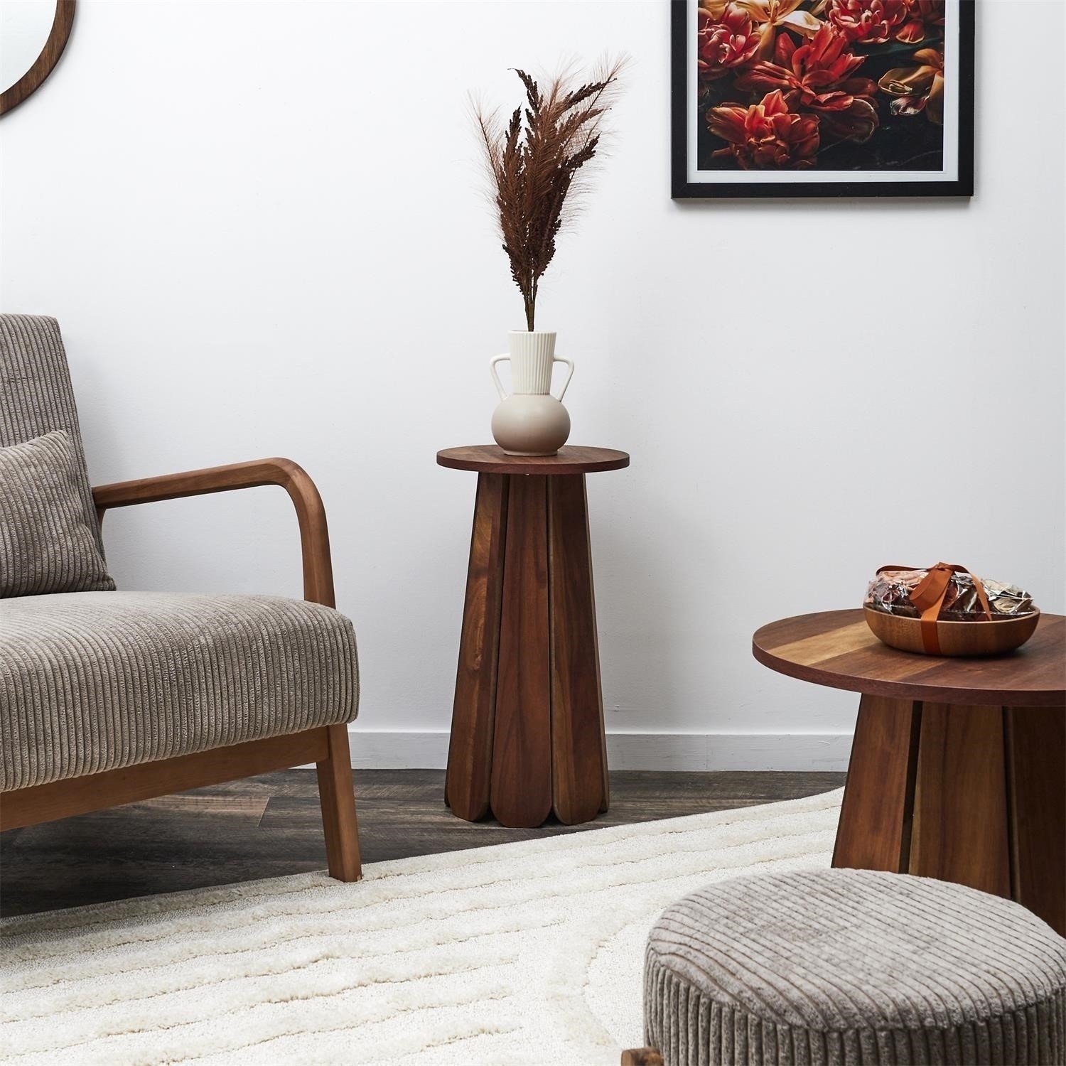 Stolik boczny Will to funkcjonalny dodatek do każdego wnętrza. Dostępny w dwóch rozmiarach, pozwala na dopasowanie do indywidualnych potrzeb. Eleganckie wykończenie w kolorze orzecha nadaje mu klasyczny wygląd, a kompaktowe wymiary czynią go idealnym jako stolik pomocniczy przy sofie czy fotelu.