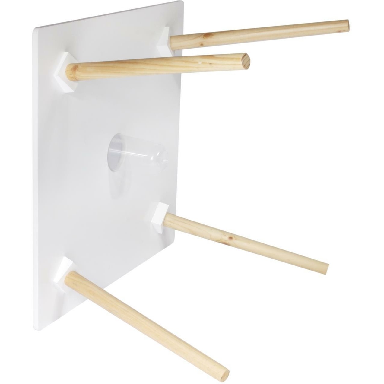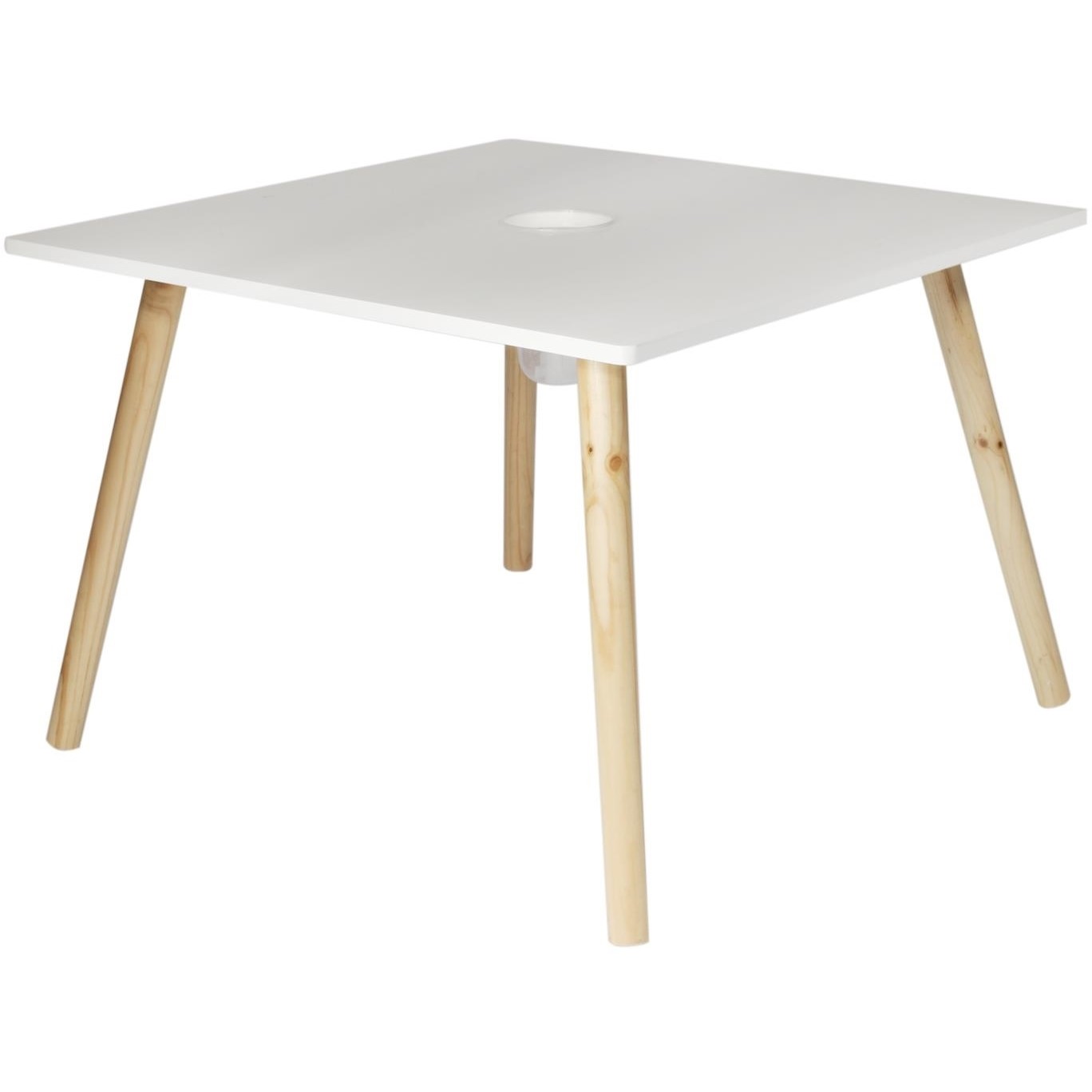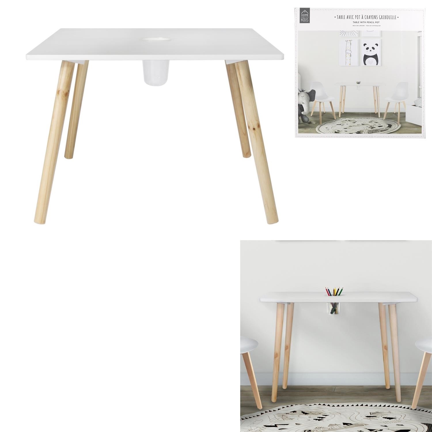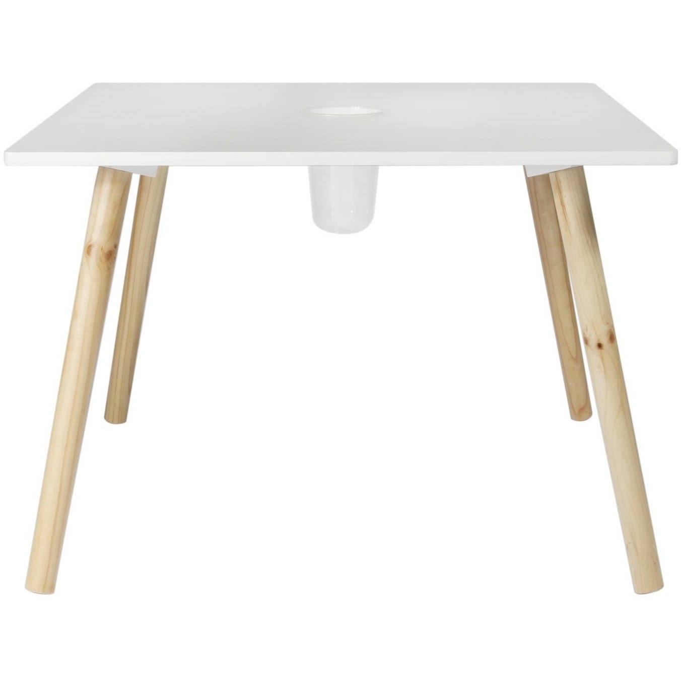 Stolik dziecięcy z kubkiem na kredki to idealne rozwiązanie dla małych artystów. Wykonany z płyty MDF fornirowanej na biało, stolik ten doskonale wpisuje się w skandynawski styl wnętrz. Jego kwadratowy blat wyposażony jest w praktyczny uchwyt na kubek, który umożliwia przechowywanie kredek, flamastrów czy pędzli.
