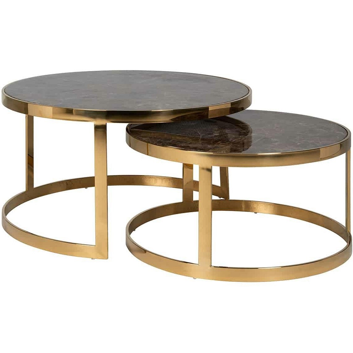 CONRAD to zestaw 2 stolików kawowych wyprodukowanych w wyjątkowym stylu. Wykonane są z połączenia konglomeratu i stali nierdzewnej, dzięki czemu są niezwykle wytrzymałe i odporne na uszkodzenia. Stoliki mają klasyczny kształt okrągłej podstawy, a blaty są wykonane z połączenia konglomeratu imitującego marmur Emperador, dzięki czemu są trwałe i stylowe. Stoliki są złote, co sprawia, że idealnie wpisują się w modne wnętrza. Są one bardzo wygodne w użyciu. Jest to idealny dodatek do salonu lub biura.