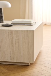 Stolik kawowy Dice to elegancka propozycja dla miłośników nowoczesnego designu i naturalnych wykończeń. Model w wersji trawertynowej zachwyca nowoczesnym charakterem, podkreślonym przez subtelną cokołową podstawę. Oferuje dużo miejsca na stos książek, dekoracje czy serwowanie napojów podczas spotkań.