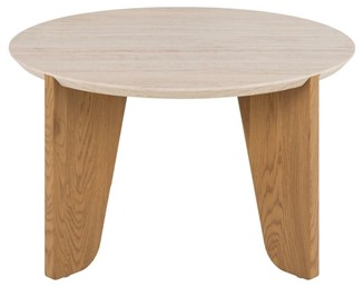 - Okrągły stolik kawowy łączący wygląd trawertynu z dzikim dębem