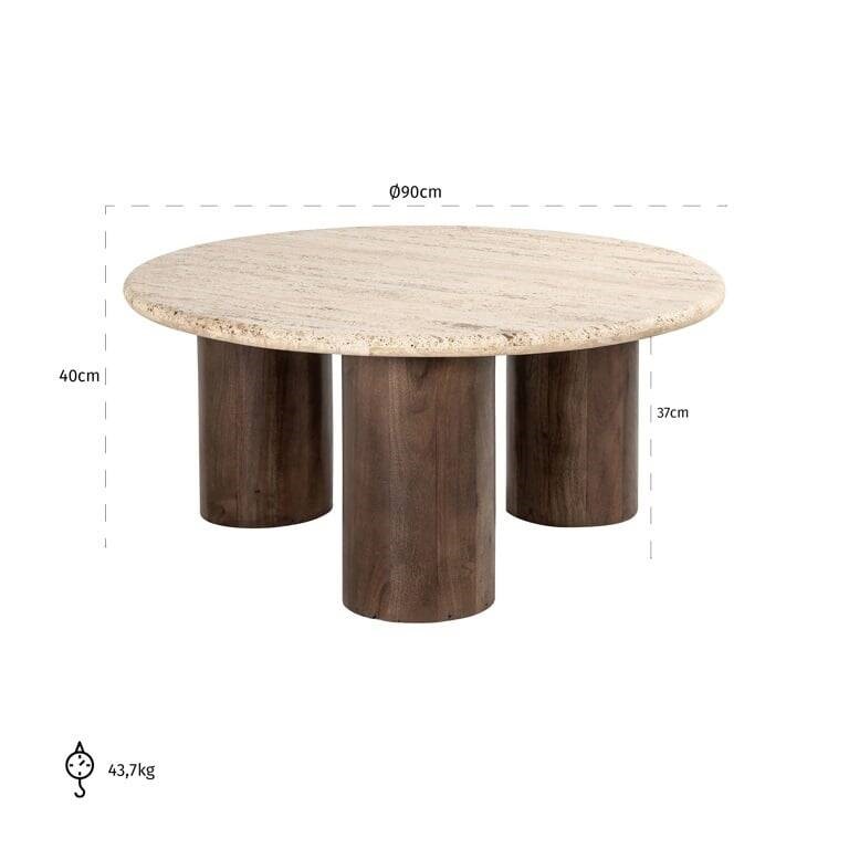 Piękny, okrągły blat wykonano z kamienia Trawertyn a podstawę z drewna Mango.