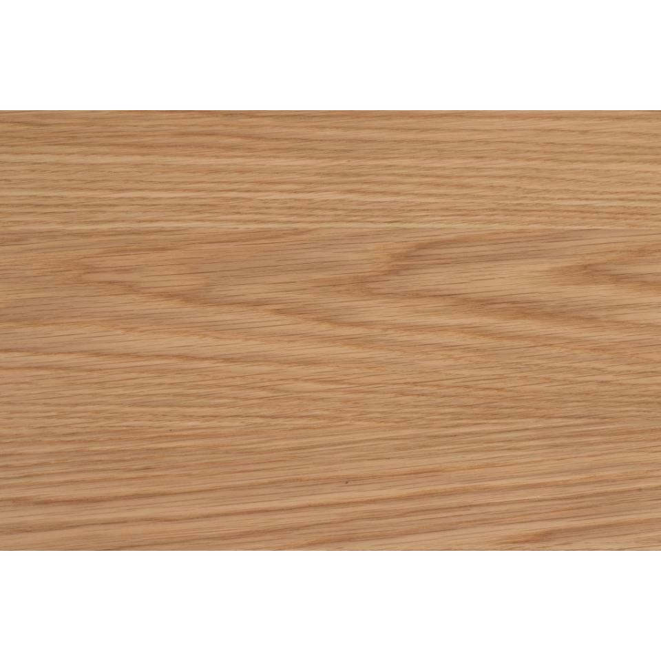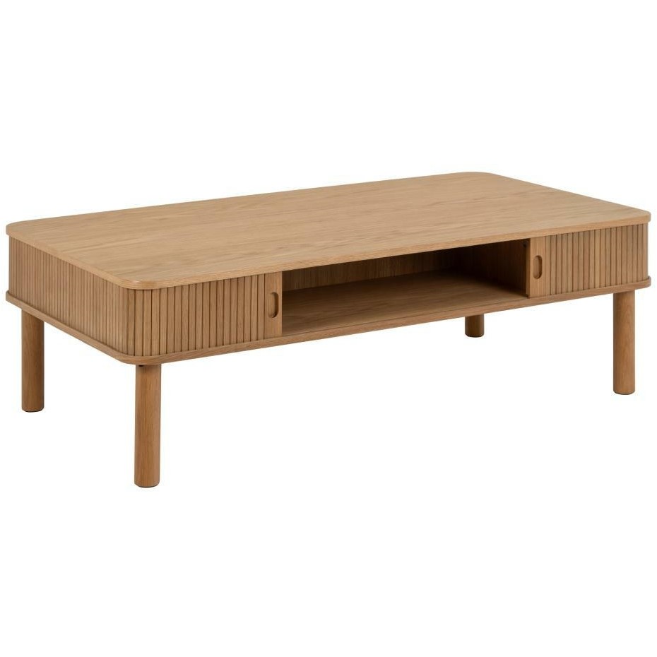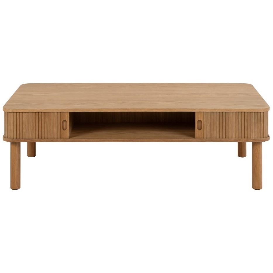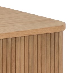Podstawa stolika wykonana jest z drewna dębowego, co zapewnia stabilność i trwałość mebla. Dodatkowo, stolik wyposażony jest w przesuwane drzwiczki i otwartą przegrodę, co umożliwia wygodne przechowywanie różnych przedmiotów. Dekory z lakierowanego dębu dodają mu wyjątkowego charakteru i naturalnego uroku.