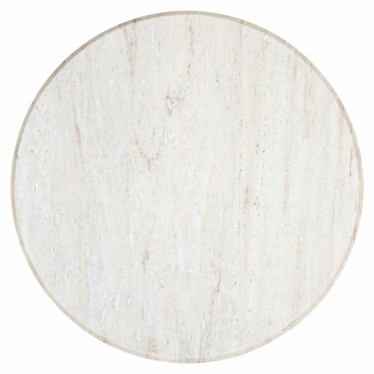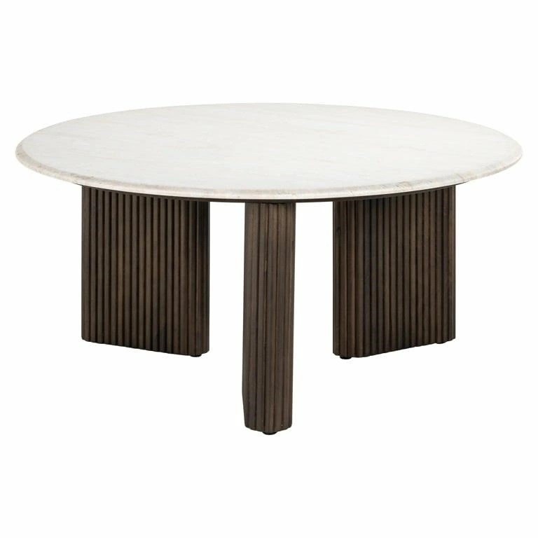 Piękny, okrągły blat zdobi biały marmur, a podstawę o ciekawym kształcie drewniane lamele.