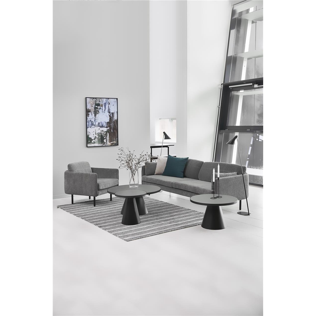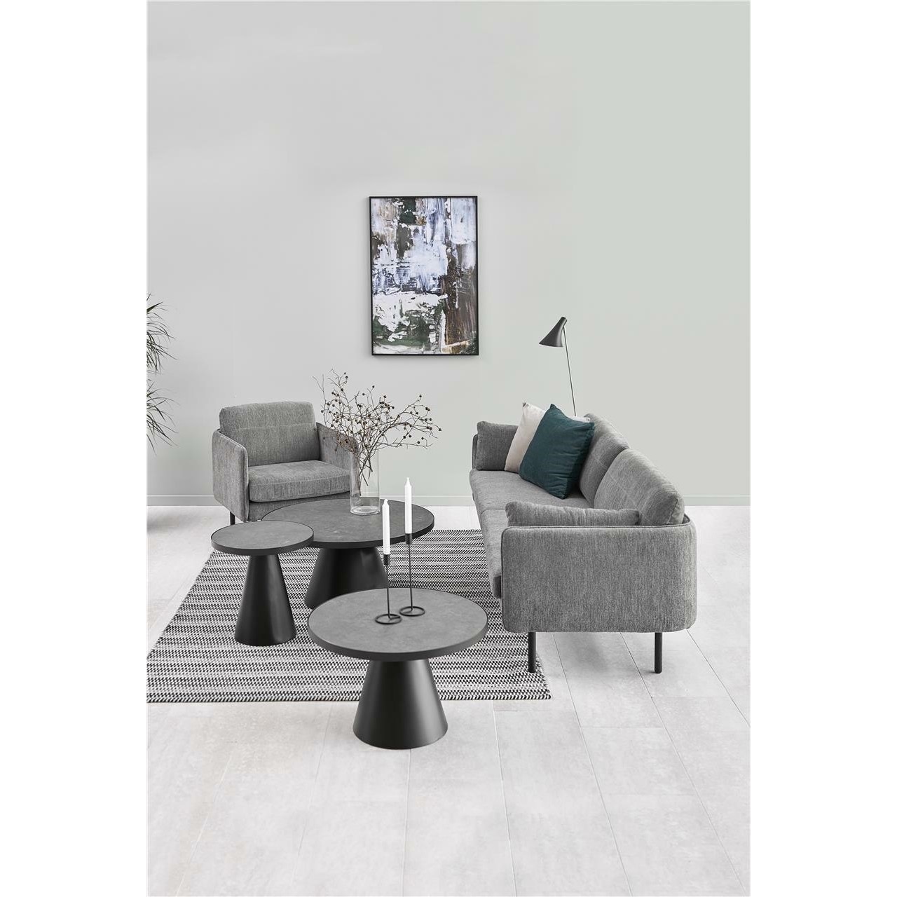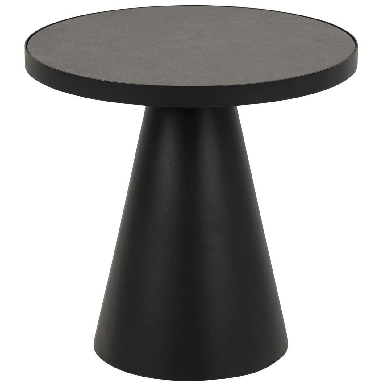 Stolik kawowy Soli 45 to elegancki mebel, który doskonale wpasuje się w nowoczesne wnętrza. Jego okrągły blat wykonany jest z ceramiki oraz szkła w kolorze szarym, co nadaje mu wyjątkowy wygląd. Podstawa stolika, wykonana z czarnego metalu, ma matowe wykończenie i rozszerza się ku dołowi, co zapewnia stabilność i trwałość.